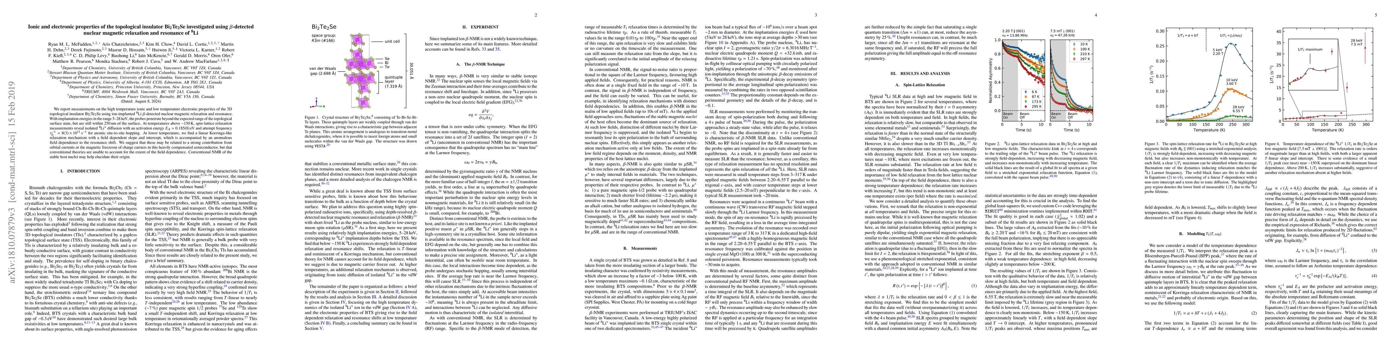 We report measurements on the high temperature ionic and low temperature electronic properties of the 3D topological insulator Bi$_2$Te$_2$Se using ion-implanted $^8$Li $\beta$-detected nuclear magnetic relaxation and resonance. With implantation energies in the range 5-28 keV, the probes penetrate beyond the expected range of the topological surface state, but are still within 250 nm of the surface. At temperatures above ~150 K, spin-lattice relaxation measurements reveal isolated $^8$Li$^{+}$ diffusion with an activation energy $E_{A} = 0.185(8)$ eV and attempt frequency $\tau_{0}^{-1} = 8(3) \times 10^{11}$ s$^{-1}$ for atomic site-to-site hopping. At lower temperature, we find a linear Korringa-like relaxation mechanism with a field dependent slope and intercept, which is accompanied by an anomalous field dependence to the resonance shift. We suggest that these may be related to a strong contribution from orbital currents or the magnetic freezeout of charge carriers in this heavily compensated semiconductor, but that conventional theories are unable to account for the extent of the field dependence. Conventional NMR of the stable host nuclei may help elucidate their origin.
