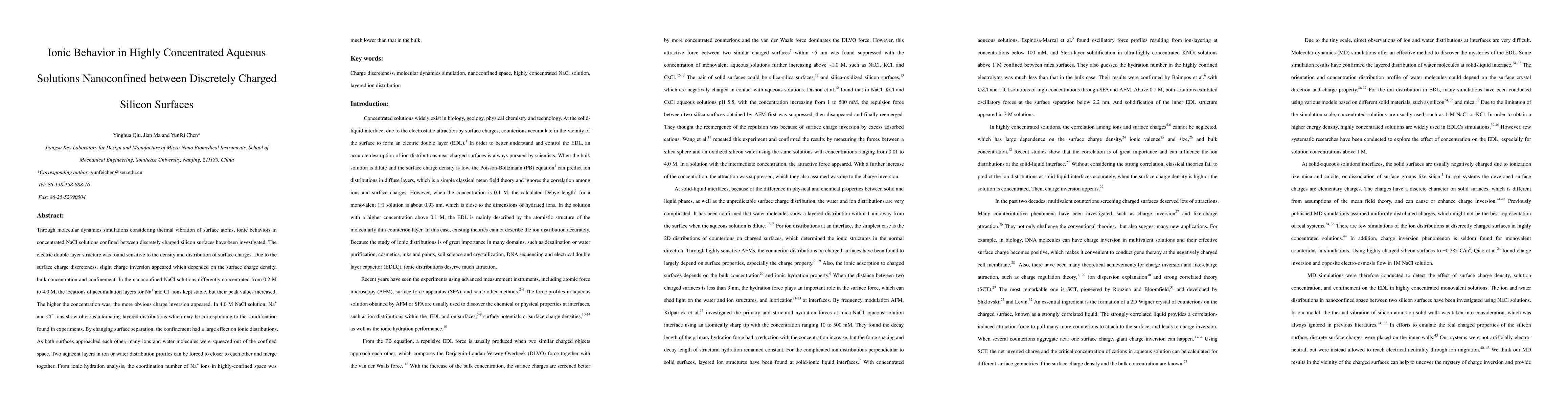This study uses molecular dynamics simulations to explore ionic behavior in highly concentrated NaCl solutions confined between discretely charged silicon surfaces, revealing that the electric double layer structure is sensitive to surface charge density and bulk concentration, with significant charge inversion and ion layering effects observed at higher concentrations.