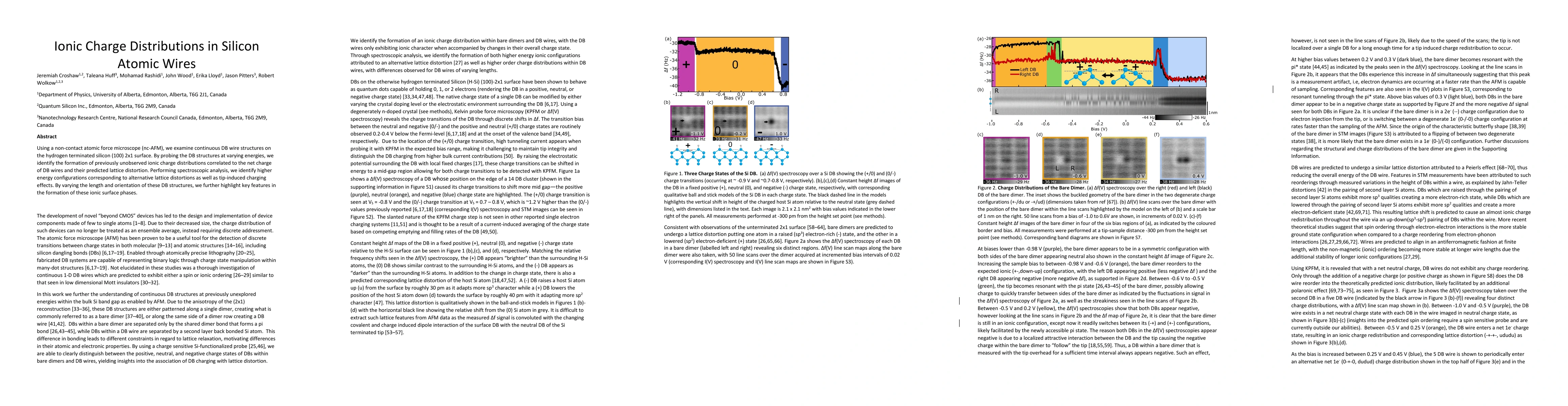 This study utilizes a non-contact atomic force microscope to investigate DB wire structures on silicon surfaces, revealing previously unobserved ionic charge distributions linked to net charge and lattice distortion. Spectroscopic analysis identifies higher energy configurations and tip-induced charging effects, while varying DB structure length and orientation highlights key features in ionic surface phase formation.