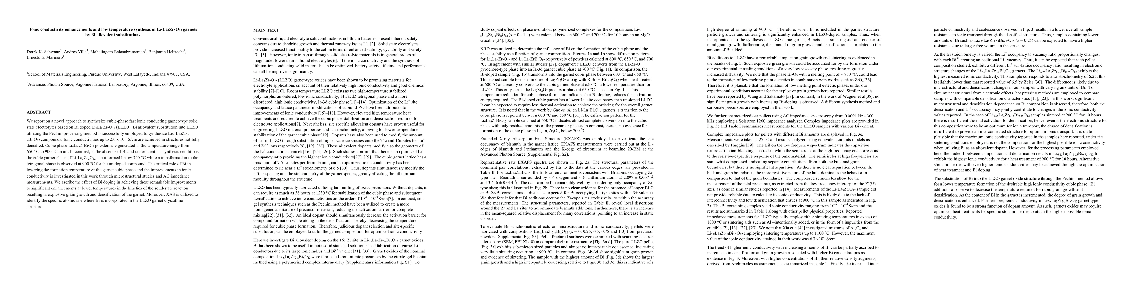This paper investigates the synthesis of Bi-doped Li7La3Zr2O12 garnets using the Pechini method, achieving enhanced ionic conductivity up to 2.0 x 10^-4 S/cm. Bi doping lowers the synthesis temperature for the cubic phase formation and significantly improves ionic conductivity through enhanced reaction kinetics and grain growth.