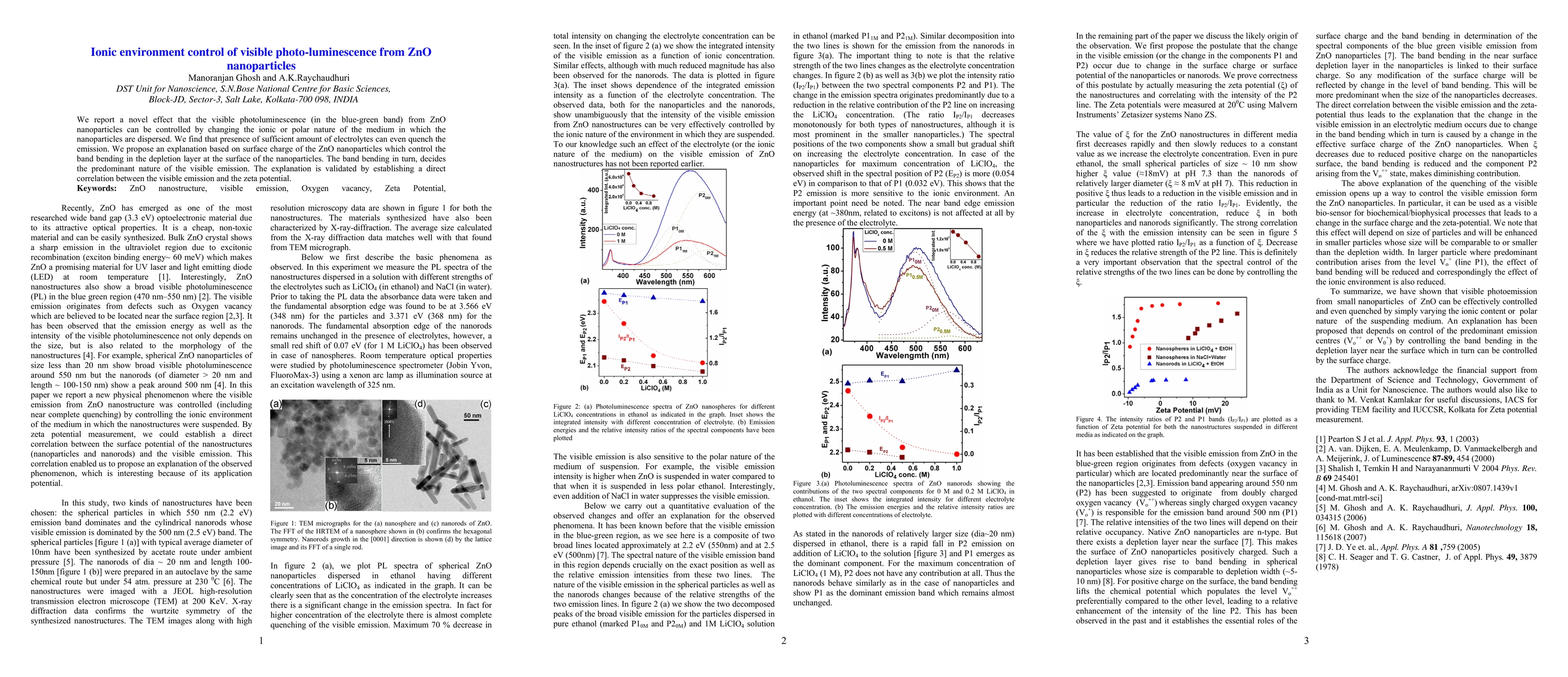 Researchers found that the visible photoluminescence from zinc oxide nanoparticles can be controlled by changing the ionic environment in which they are dispersed, with sufficient electrolytes even quenching the emission.