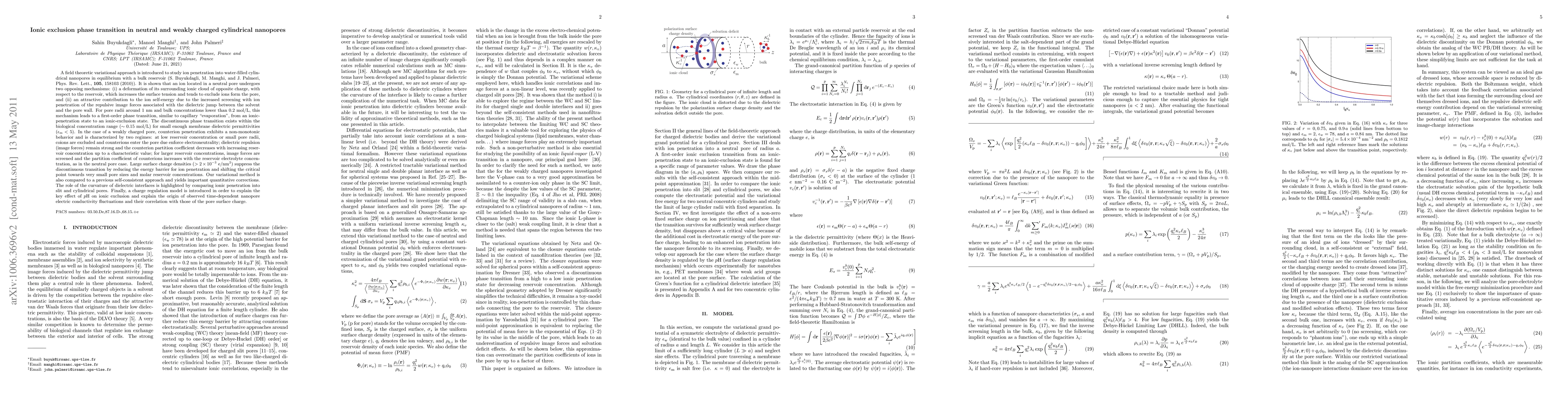 This paper uses a field theoretic variational approach to investigate ion behavior in neutral and weakly charged cylindrical nanopores, revealing a first-order phase transition from ionic penetration to exclusion under certain conditions. For weakly charged pores, counterion behavior shows non-monotonicity, transitioning from exclusion to increased penetration with higher electrolyte concentrations.