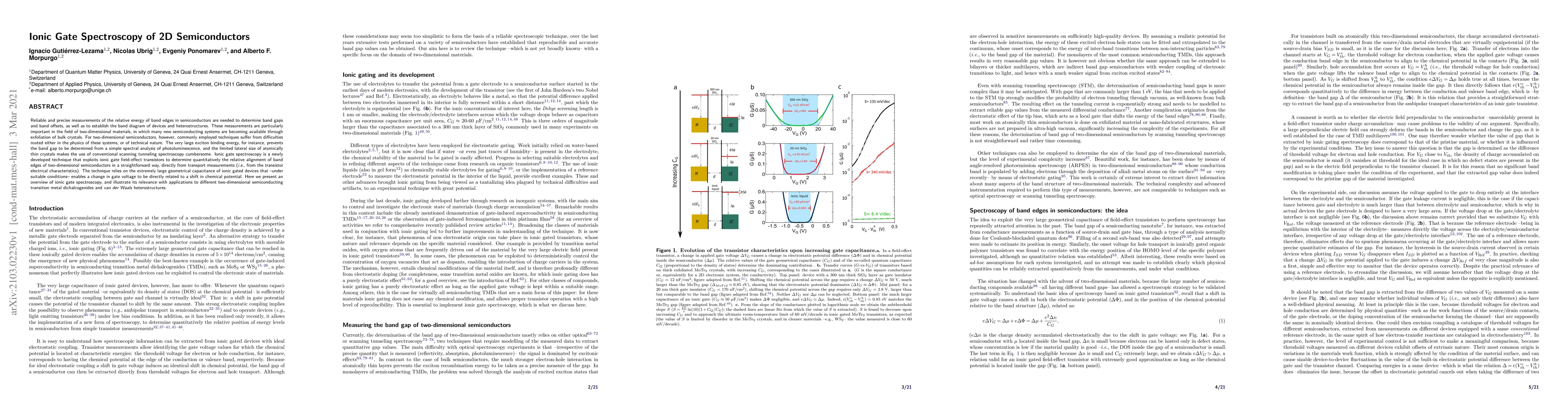 Ionic gate spectroscopy is a novel technique for precisely measuring band edge energies in 2D semiconductors, overcoming limitations of traditional methods. It uses ionic gate field-effect transistors to directly relate gate voltage changes to chemical potential shifts, offering a straightforward method for determining band alignments in various 2D materials like TMDCs and van der Waals heterostructures.