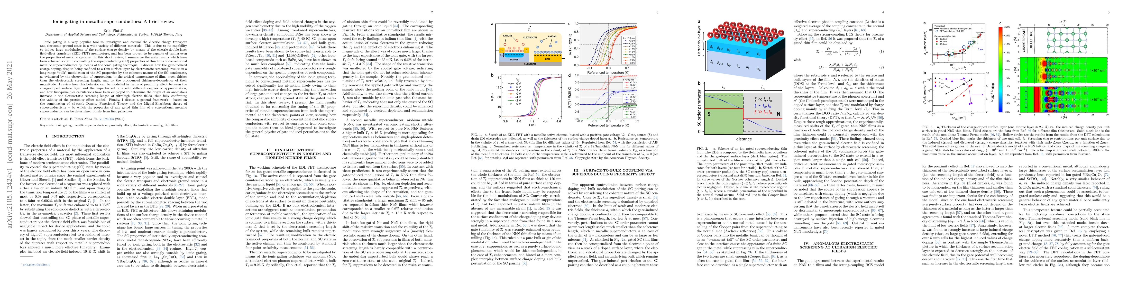 Ionic gating is a very popular tool to investigate and control the electric charge transport and electronic ground state in a wide variety of different materials. This is due to its capability to induce large modulations of the surface charge density by means of the electric-double-layer field-effect transistor (EDL-FET) architecture, and has been proven to be capable of tuning even the properties of metallic systems. In this short review, I summarize the main results which have been achieved so far in controlling the superconducting (SC) properties of thin films of conventional metallic superconductors by means of the ionic gating technique. I discuss how the gate-induced charge doping, despite being confined to a thin surface layer by electrostatic screening, results in a long-range "bulk" modulation of the SC properties by the coherent nature of the SC condensate, as evidenced by the observation of suppressions in the critical temperature of films much thicker than the electrostatic screening length, and by the pronounced thickness-dependence of their magnitude. I review how this behavior can be modelled in terms of proximity effect between the charge-doped surface layer and the unperturbed bulk with different degrees of approximation, and how first-principles calculations have been employed to determine the origin of an anomalous increase in the electrostatic screening length at ultrahigh electric fields, thus fully confirming the validity of the proximity effect model. Finally, I discuss a general framework - based on the combination of ab-initio Density Functional Theory and the Migdal-Eliashberg theory of superconductivity - by which the properties of any gated thin film of a conventional metallic superconductor can be determined purely from first principles.
