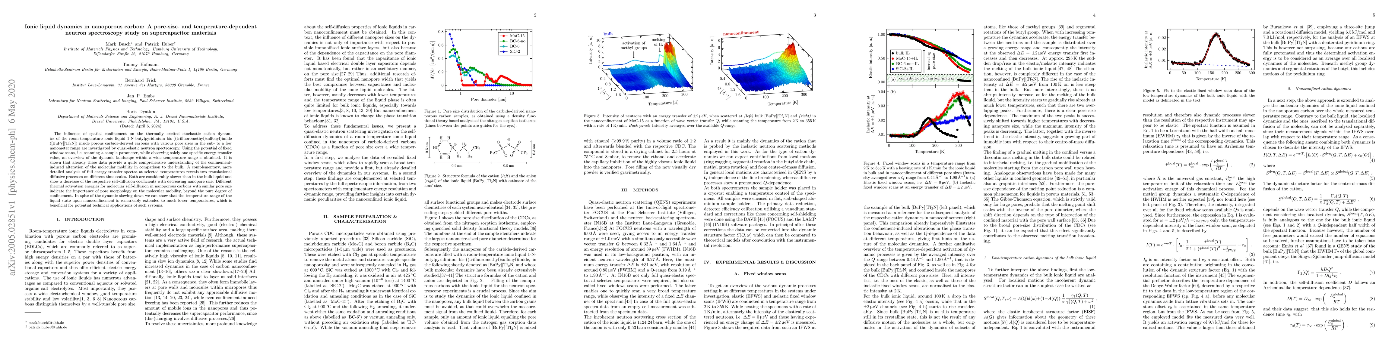 The influence of spatial confinement on the thermally excited stochastic cation dynamics of the room-temperature ionic liquid 1-N-butylpyridinium bis-((trifluoromethyl)sulfonyl)imide ([BuPy][Tf_2N]) inside porous carbide-derived carbons with various pore sizes in the sub- to a few nanometer range are investigated by quasi-elastic neutron spectroscopy. Using the potential of fixed window scans, i.e. scanning a sample parameter, while observing solely one specific energy transfer value, an overview of the dynamic landscape within a wide temperature range is obtained. It is shown that already these data provide a quite comprehensive understanding of the confinement-induced alteration of the molecular mobility in comparison to the bulk. A complementary, more detailed analysis of full energy transfer spectra at selected temperatures reveals two translational diffusive processes on different time scales. Both are considerably slower than in the bulk liquid and show a decrease of the respective self-diffusion coefficients with decreasing nanopore size. Different thermal activation energies for molecular self-diffusion in nanoporous carbons with similar pore size indicate the importance of pore morphology on the molecular mobility, beyond the pure degree of confinement. In spite of the dynamic slowing down we can show that the temperature range of the liquid state upon nanoconfinement is remarkably extended to much lower temperatures, which is beneficial for potential technical applications of such systems.