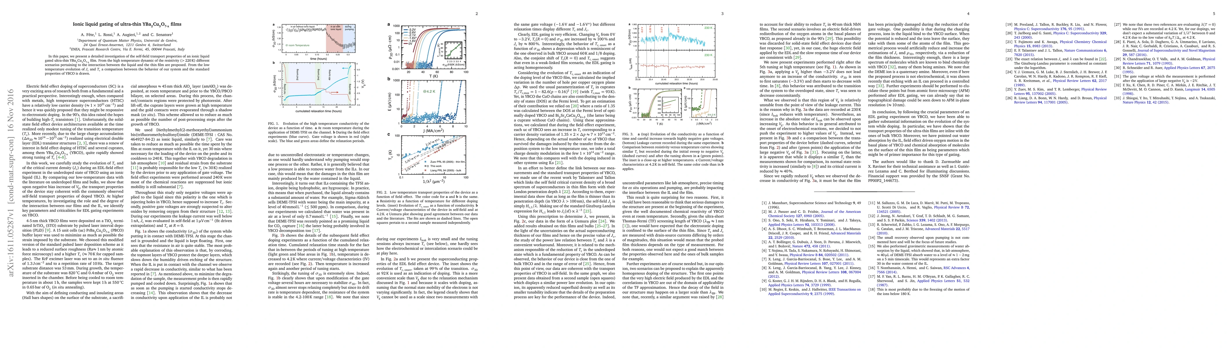 This paper investigates the transport properties of ultra-thin YBa$_2$Cu$_3$O$_{7-x}$ films gated with ionic liquid, revealing distinct interaction scenarios at high temperatures. It compares the low-temperature behavior of critical current density and critical temperature with standard YBCO properties.