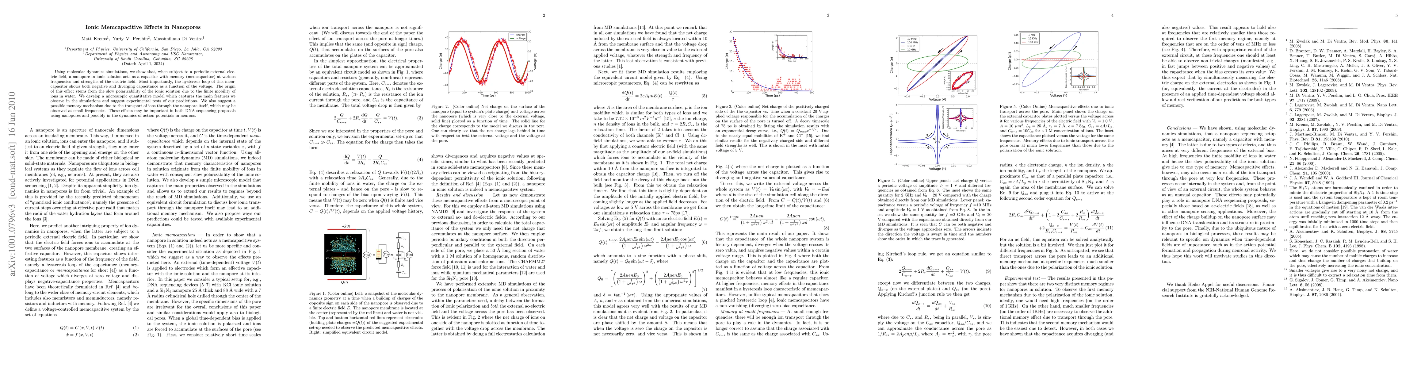 Molecular dynamics simulations reveal nanopores in ionic solutions function as memcapacitors, exhibiting memory effects with negative and diverging capacitance. This behavior arises from ionic solution polarization due to ion mobility limitations, with potential implications for nanopore DNA sequencing and neuronal action potential dynamics.