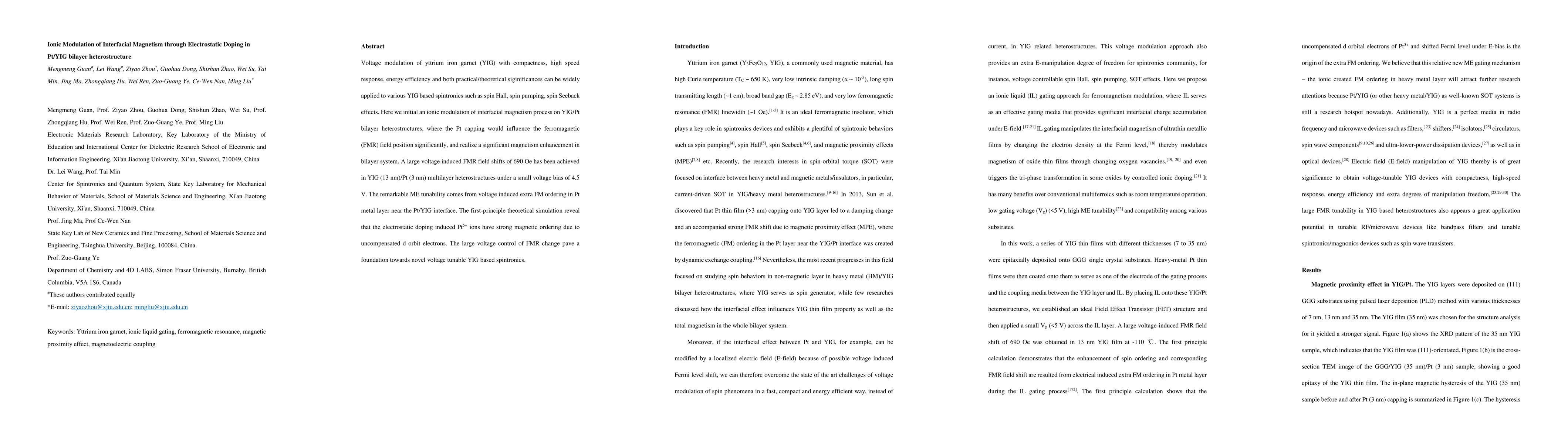 This paper investigates ionic modulation of interfacial magnetism in Pt/YIG bilayer heterostructures, achieving a significant 690 Oe ferromagnetic resonance field shift under a 4.5 V bias. The enhancement is attributed to voltage-induced extra ferromagnetic ordering in the Pt layer near the interface, driven by electrostatic doping of Pt5+ ions.
