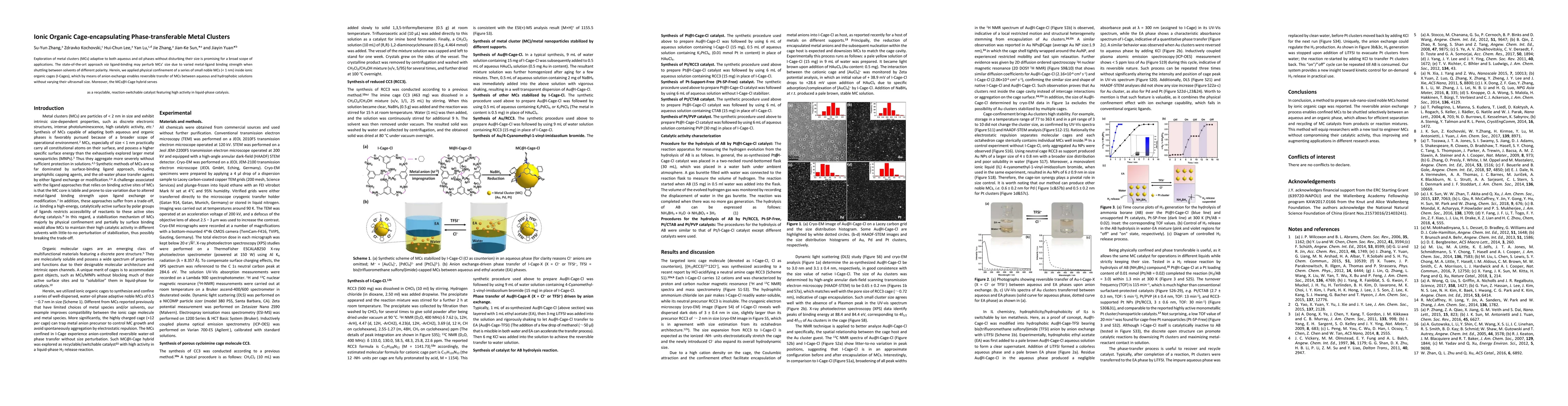 This paper explores the encapsulation of small noble metal clusters within ionic organic cages to enable their reversible transfer between aqueous and hydrophobic phases without altering their size. The MCs@I-Cage hybrids function as recyclable, reaction-switchable catalysts with high activity in liquid-phase catalysis.