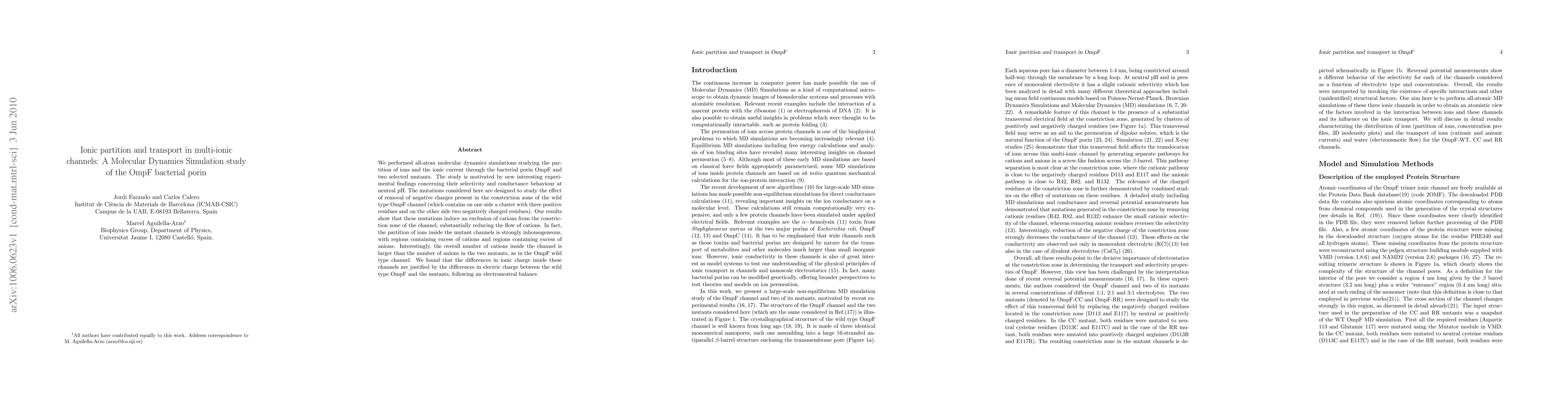 We performed all-atom molecular dynamics simulations studying the partition of ions and the ionic current through the bacterial porin OmpF and two selected mutants. The study is motivated by new interesting experimental findings concerning their selectivity and conductance behaviour at neutral pH. The mutations considered here are designed to study the effect of removal of negative charges present in the constriction zone of the wild type OmpF channel (which contains on one side a cluster with three positive residues and on the other side two negatively charged residues). Our results show that these mutations induce an exclusion of cations from the constriction zone of the channel, substantially reducing the flow of cations. In fact, the partition of ions inside the mutant channels is strongly inhomogeneous, with regions containing excess of cations and regions containing excess of anions. Interestingly, the overall number of cations inside the channel is larger than the number of anions in the two mutants, as in the OmpF wild type channel. We found that the differences in ionic charge inside these channels are justified by the differences in electric charge between the wild type OmpF and the mutants, following an electroneutral balance.