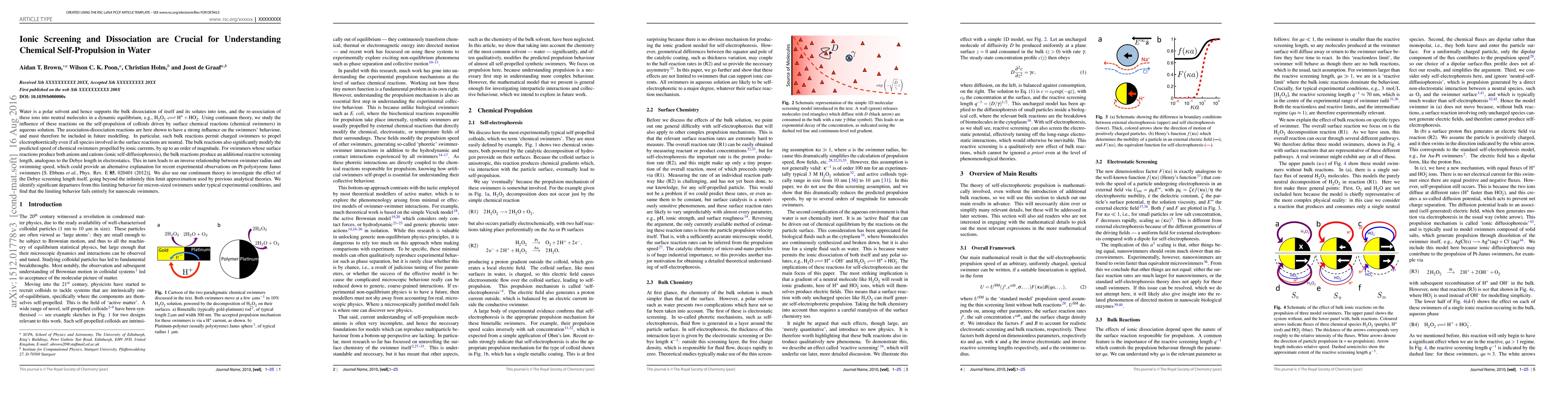 Water is a polar solvent and hence supports the bulk dissociation of itself and its solutes into ions, and the re-association of these ions into neutral molecules in a dynamic equilibrium, e.g., ${\rm H_2O_2}\leftrightharpoons {\rm H^+~+~HO_2^-}$. Using continuum theory, we study the influence of these reactions on the self-propulsion of colloids driven by surface chemical reactions (chemical swimmers) in aqueous solution. The association-dissociation reactions are here shown to have a strong influence on the swimmers' behaviour, and must therefore be included in future modelling. In particular, such bulk reactions permit charged swimmers to propel electrophoretically even if all species involved in the surface reactions are neutral. The bulk reactions also significantly modify the predicted speed of chemical swimmers propelled by ionic currents, by up to an order of magnitude. For swimmers whose surface reactions produce both anions and cations (ionic self-diffusiophoresis), the bulk reactions produce an additional reactive screening length, analogous to the Debye length in electrostatics. This in turn leads to an inverse relationship between swimmer radius and swimming speed, which could provide an alternative explanation for recent experimental observations on Pt-polystyrene Janus swimmers [S. Ebbens et al., Phys. Rev. E 85, 020401 (2012)]. We also use our continuum theory to investigate the effect of the Debye screening length itself, going beyond the infinitely thin limit approximation used by previous analytical theories. We identify significant departures from this limiting behavior for micron-sized swimmers under typical experimental conditions, and find that the limiting behavior fails entirely for nanoscale swimmers.