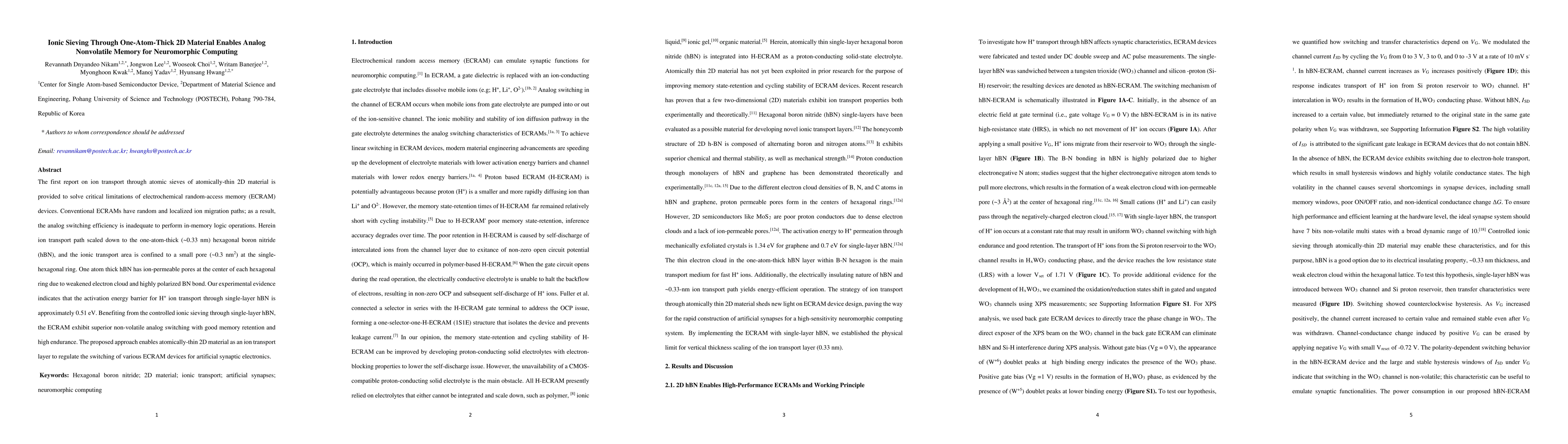 The first report on ion transport through atomic sieves of atomically-thin 2D material is provided to solve critical limitations of electrochemical random-access memory (ECRAM) devices.