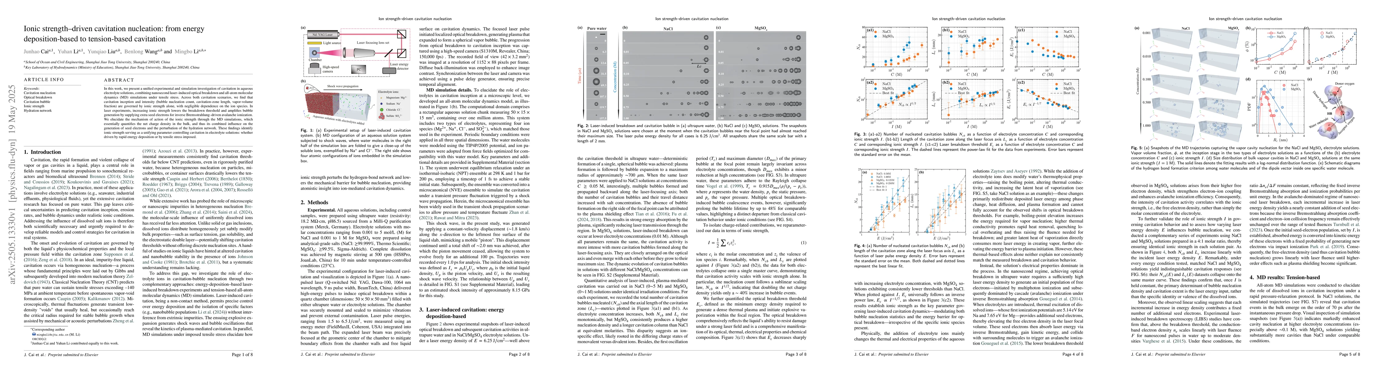 The research combines nanosecond laser-induced optical breakdown experiments with all-atom molecular dynamics (MD) simulations under tensile stress to investigate cavitation in aqueous electrolyte solutions.