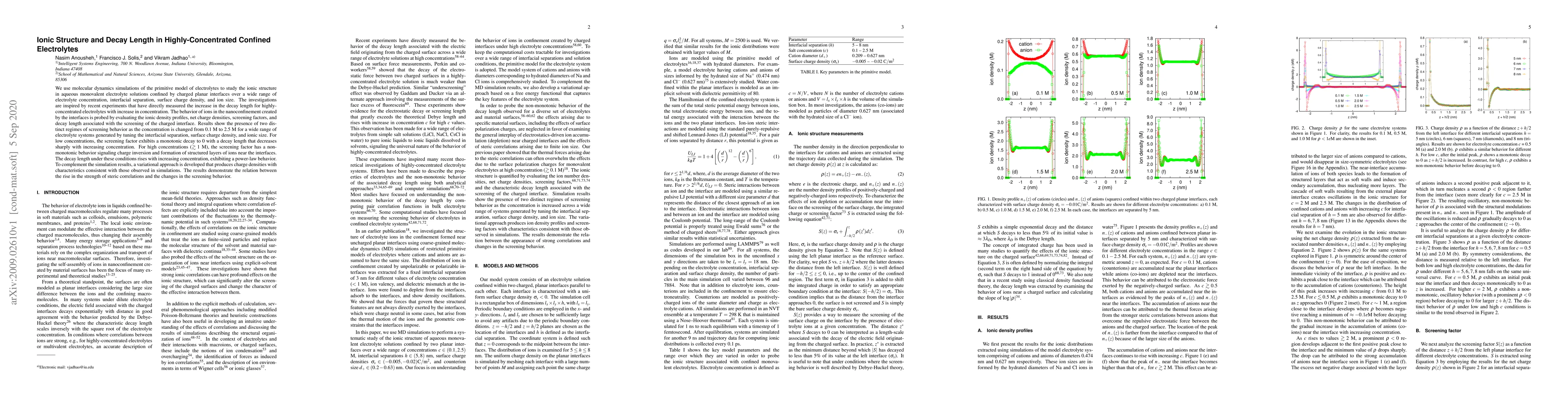 This paper uses molecular dynamics simulations to explore ionic structure and decay length in highly concentrated, confined electrolytes, revealing two distinct screening regimes: a monotonic decay at low concentrations and non-monotonic behavior with charge inversion and structured ion layers at high concentrations. The decay length increases with concentration, showing a power-law relationship.