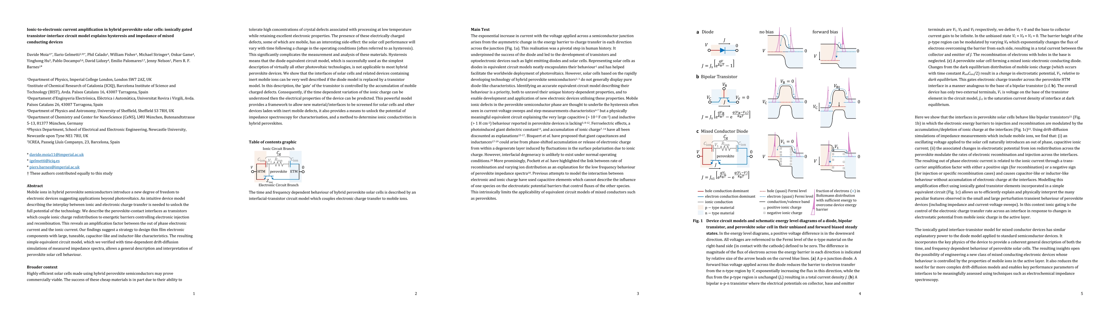 This paper proposes a transistor-interface circuit model to explain the ionic-to-electronic current amplification in hybrid perovskite solar cells, addressing hysteresis and impedance. The model reveals the coupling between ionic charge redistribution and electronic injection/recombination, offering insights into designing advanced thin-film electronic components.