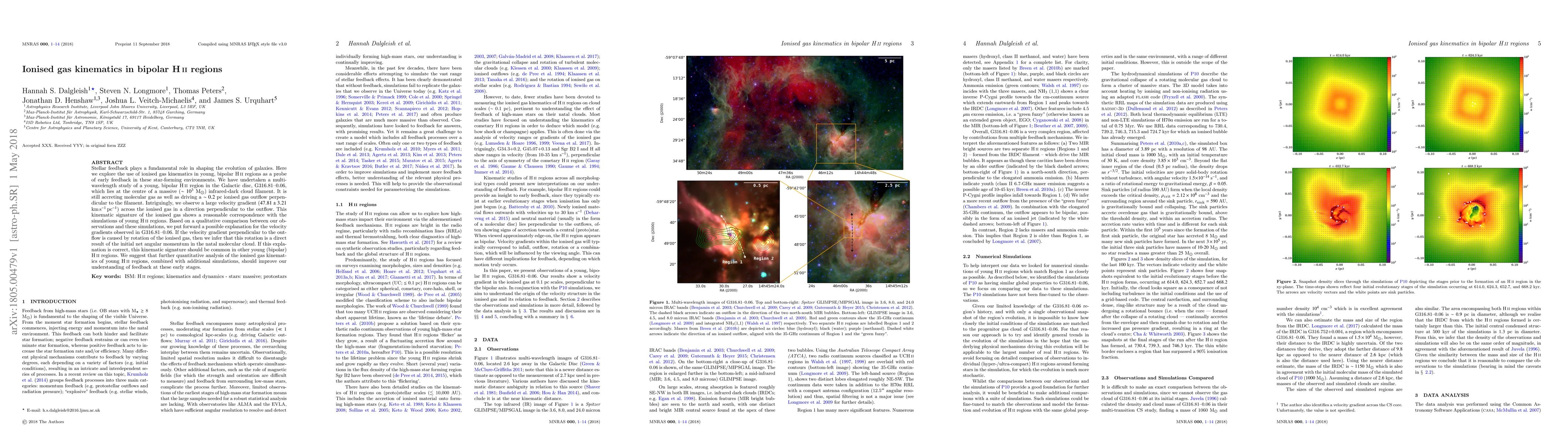 Stellar feedback plays a fundamental role in shaping the evolution of galaxies. Here we explore the use of ionised gas kinematics in young, bipolar H II regions as a probe of early feedback in these star-forming environments. We have undertaken a multiwavelength study of a young, bipolar H II region in the Galactic disc, G$316.81-0.06$, which lies at the centre of a massive ($\sim10^3$ M$_{\odot}$) infrared-dark cloud filament. It is still accreting molecular gas as well as driving a $\sim 0.2$ pc ionised gas outflow perpendicular to the filament. Intriguingly, we observe a large velocity gradient ($47.81 \pm 3.21$ km s$^{-1}$ pc$^{-1}$) across the ionised gas in a direction perpendicular to the outflow. This kinematic signature of the ionised gas shows a reasonable correspondence with the simulations of young H II regions. Based on a qualitative comparison between our observations and these simulations, we put forward a possible explanation for the velocity gradients observed in G$316.81-0.06$. If the velocity gradient perpendicular to the outflow is caused by rotation of the ionised gas, then we infer that this rotation is a direct result of the initial net angular momentum in the natal molecular cloud. If this explanation is correct, this kinematic signature should be common in other young (bipolar) H II regions. We suggest that further quantitative analysis of the ionised gas kinematics of young H II regions, combined with additional simulations, should improve our understanding of feedback at these early stages.