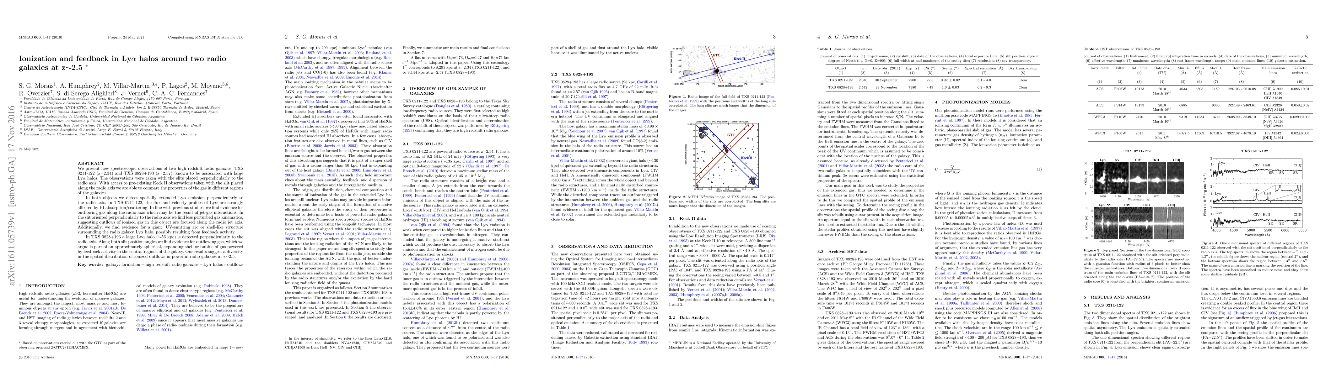 We present new spectroscopic observations of two high redshift radio galaxies, TXS 0211-122 (z=2.34) and TXS 0828+193 (z=2.57), known to be associated with large Ly$\alpha$ halos. The observations were taken with the slits placed perpendicularly to the radio axis. With access to pre-existing Keck II observations taken with the slit placed along the radio axis we are able to compare the properties of the gas in different regions of the galaxies. In both objects we detect spatially extended Ly$\alpha$ emission perpendicularly to the radio axis. In TXS 0211-122, the flux and velocity profiles of Ly$\alpha$ are strongly affected by HI absorption/scattering. In line with previous studies, we find evidence for outflowing gas along the radio axis which may be the result of jet-gas interactions. In the slit oriented perpendicularly to the radio axis we find less perturbed gas kinematics, suggesting outflows of ionized gas in this object are focused along the radio jet axis. Additionally, we find evidence for a giant, UV-emitting arc or shell-like structure surrounding the radio galaxy Ly$\alpha$ halo, possibly resulting from feedback activity. In TXS 0828+193 a large Ly$\alpha$ halo ($\sim$56 kpc) is detected perpendicularly to the radio axis. Along both slit position angles we find evidence for outflowing gas, which we argue is part of an approximately spherical, expanding shell or bubble of gas powered by feedback activity in the central regions of the galaxy. Our results suggest a diversity in the spatial distribution of ionized outflows in powerful radio galaxies at z$\sim$2.5.