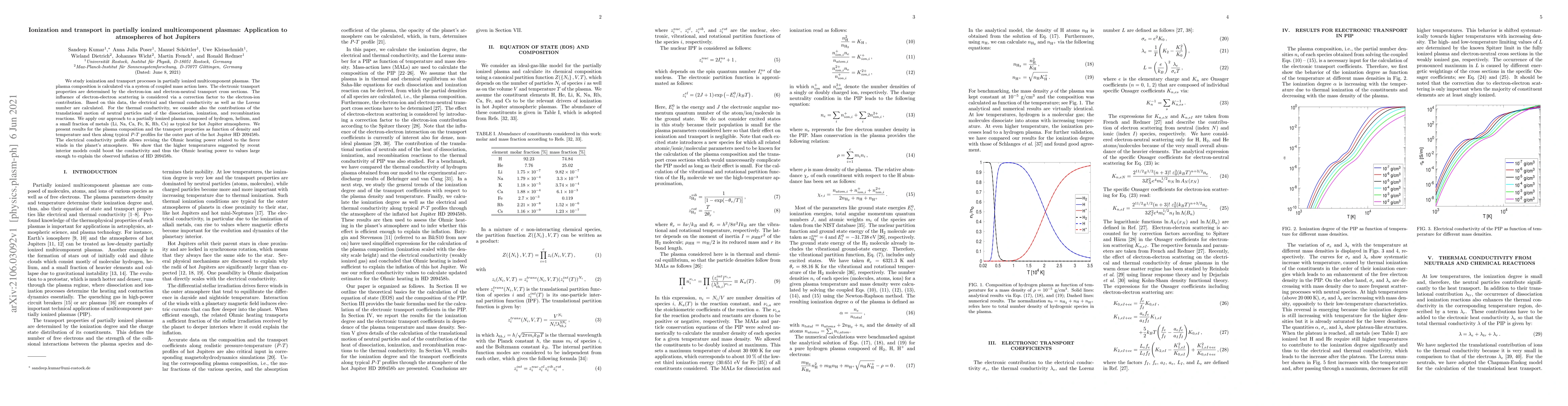 We study ionization and transport processes in partially ionized multicomponent plasmas. The plasma composition is calculated via a system of coupled mass action laws. The electronic transport properties are determined by the electron-ion and electron-neutral transport cross sections. The influence of electron-electron scattering is considered via a correction factor to the electron-ion contribution. Based on this data, the electrical and thermal conductivity as well as the Lorenz number are calculated. For the thermal conductivity, we consider also the contributions of the translational motion of neutral particles and of the dissociation, ionization, and recombination reactions. We apply our approach to a partially ionized plasma composed of hydrogen, helium, and a small fraction of metals (Li, Na, Ca, Fe, K, Rb, Cs) as typical for hot Jupiter atmospheres. We present results for the plasma composition and the transport properties as function of density and temperature and then along typical P-T profiles for the outer part of the hot Jupiter HD 209458b. The electrical conductivity profile allows revising the Ohmic heating power related to the fierce winds in the planet's atmosphere. We show that the higher temperatures suggested by recent interior models could boost the conductivity and thus the Ohmic heating power to values large enough to explain the observed inflation of HD 209458b.