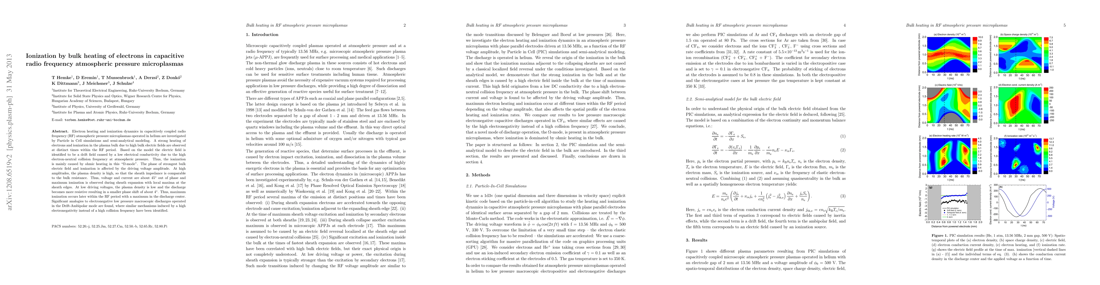 This paper investigates the electron heating and ionization dynamics in capacitively coupled radio frequency atmospheric pressure microplasmas using simulations and modeling. It finds that ionization is primarily due to ohmic heating in the bulk plasma, with the strongest electric field and ionization occurring at specific times within the RF period, influenced by the driving voltage amplitude.