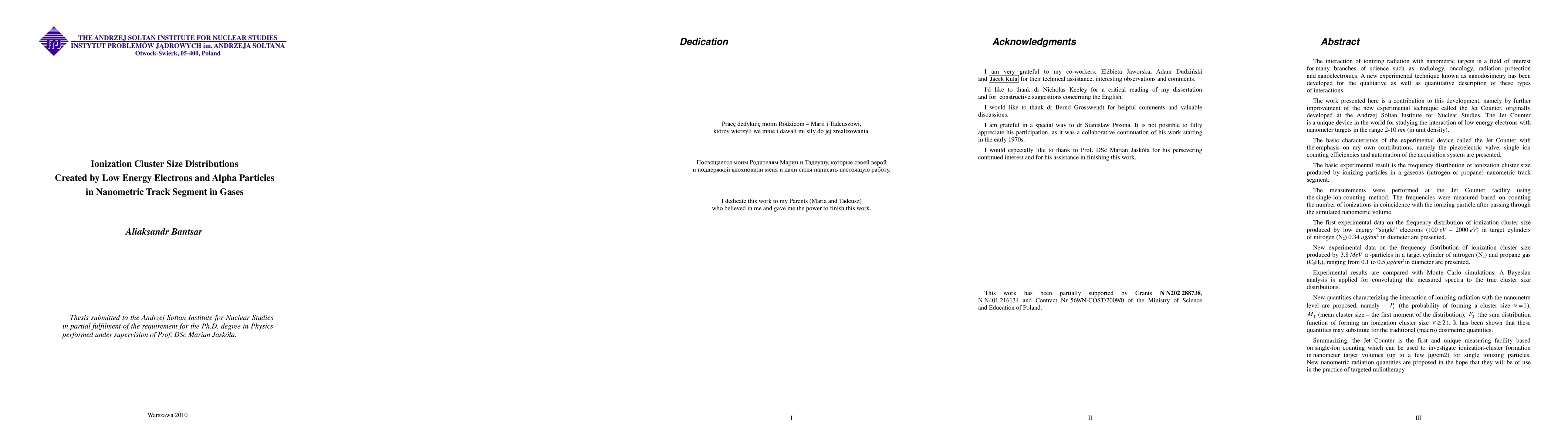 The interaction of ionizing radiation with nanometric targets is a field of interest for many branches of science such as: radiology, oncology, radiation protection and nanoelectronics. A new experimental technique known as nanodosimetry has been developed for the qualitative as well as quantitative description of these types of interactions. The work presented here is a contribution to this development, namely by further improvement of the new experimental technique called the Jet Counter, originally developed at the Andrzej So{\l}tan Institute for Nuclear Studies. The Jet Counter is a unique device in the world for studying the interaction of low energy electrons with nanometer targets in the range 2-10 nm (in unit density). The basic experimental result is the frequency distribution of ionization cluster size produced by ionizing particles in a gaseous (nitrogen or propane) nanometric track segment. The first experimental data on the frequency distribution of ionization cluster size produced by low energy "single" electrons (100 eV - 2000 eV) in target cylinders of nitrogen (N2) 0.34 {\mu}g/cm2. in diameter are presented. New experimental data on the frequency distribution of ionization cluster size produced by 3.8 MeV {\alpha}-particles in a target cylinder of nitrogen (N2) and propane gas (C3H8), ranging from 0.1 to 0.5 {\mu}g/cm2 in diameter are presented. Experimental results are compared with Monte Carlo simulations. A Bayesian analysis is applied for convoluting the measured spectra to the true cluster size distributions. New quantities characterizing the interaction of ionizing radiation with the nanometre level are proposed, namely - P1, M1 and F2. It has been shown that these quantities may substitute for the traditional (macro) dosimetric quantities.
