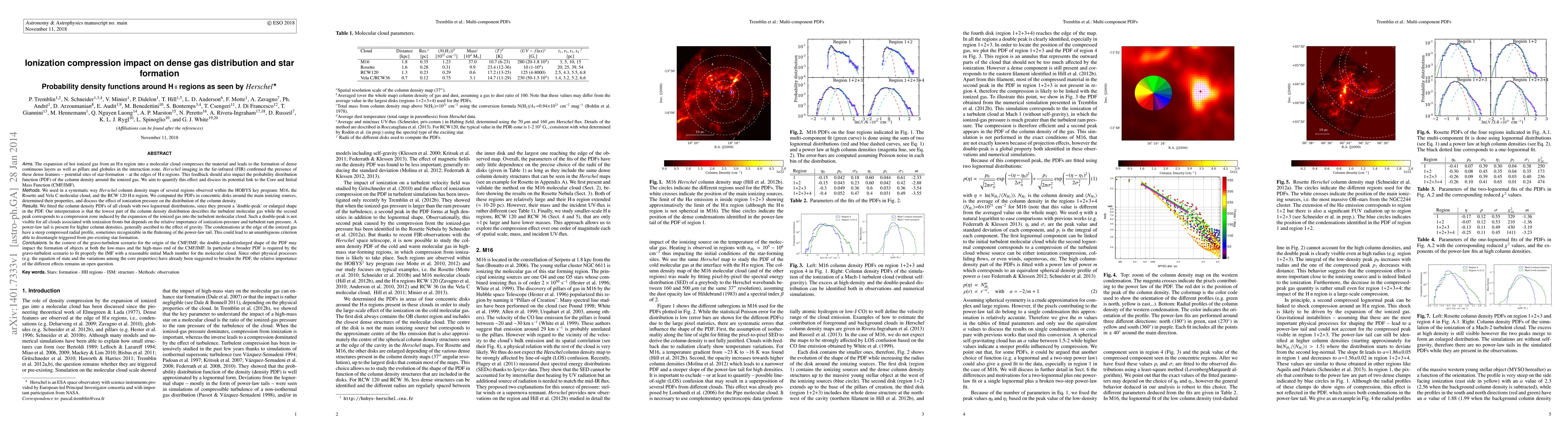 Ionization feedback should impact the probability distribution function (PDF) of the column density around the ionized gas. We aim to quantify this effect and discuss its potential link to the Core and Initial Mass Function (CMF/IMF). We used in a systematic way Herschel column density maps of several regions observed within the HOBYS key program: M16, the Rosette and Vela C molecular cloud, and the RCW 120 H ii region. We fitted the column density PDFs of all clouds with two lognormal distributions, since they present a double-peak or enlarged shape in the PDF. Our interpretation is that the lowest part of the column density distribution describes the turbulent molecular gas while the second peak corresponds to a compression zone induced by the expansion of the ionized gas into the turbulent molecular cloud. The condensations at the edge of the ionized gas have a steep compressed radial profile, sometimes recognizable in the flattening of the power-law tail. This could lead to an unambiguous criterion able to disentangle triggered from pre-existing star formation. In the context of the gravo-turbulent scenario for the origin of the CMF/IMF, the double peaked/enlarged shape of the PDF may impact the formation of objects at both the low-mass and the high-mass end of the CMF/IMF. In particular a broader PDF is required by the gravo-turbulent scenario to fit properly the IMF with a reasonable initial Mach number for the molecular cloud. Since other physical processes (e.g. the equation of state and the variations among the core properties) have already been suggested to broaden the PDF, the relative importance of the different effects remains an open question.