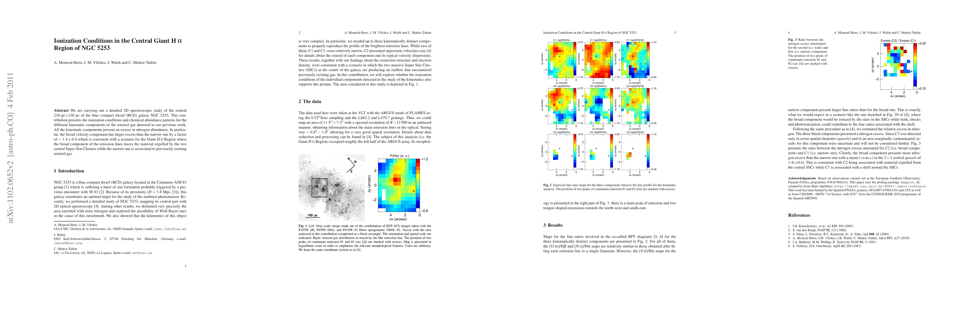 We are carrying out a detailed 2D spectroscopic study of the central 210 pc X 130 pc of the blue compact dwarf (BCD) galaxy NGC5253. This contribution presents the ionization conditions and chemical abundance patterns for the different kinematic components of the ionized gas detected in our previous work. All the kinematic components present an excess in nitrogen abundance. In particular, the broad velocity component has larger excess than the narrow one by a factor of ~1.4+-0.4 which is consistent with a scenario for the Giant HII Region where the broad component of the emission lines traces the material expelled by the two central Super Star Clusters while the narrow one is associated to previously existing ionized gas.