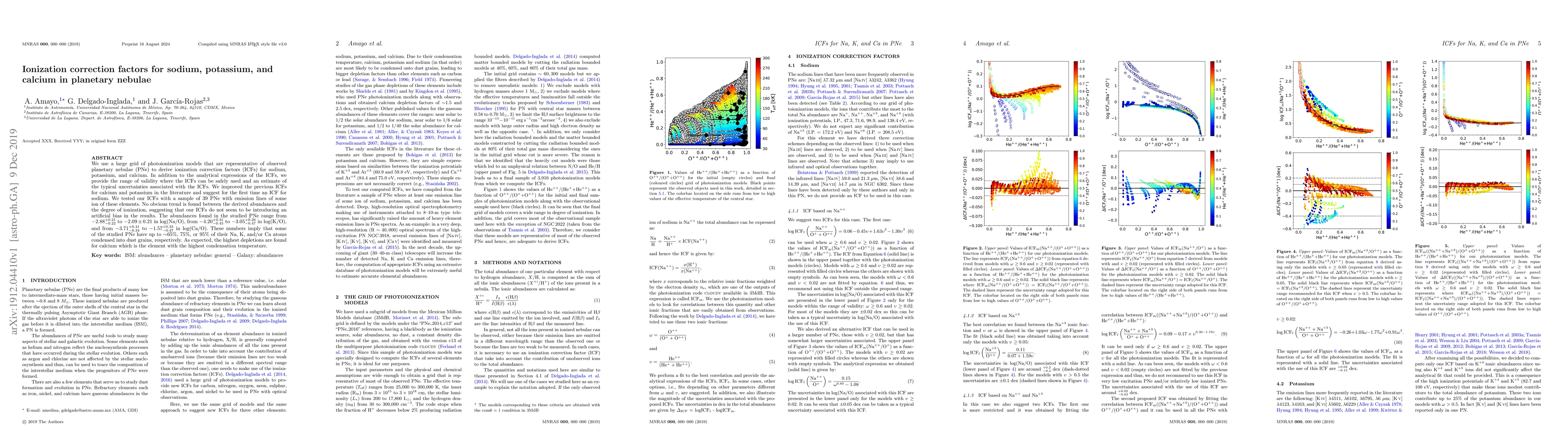 We use a large grid of photoionization models that are representative of observed planetary nebulae (PNe) to derive ionization correction factors (ICFs) for sodium, potassium, and calcium. In addition to the analytical expressions of the ICFs, we provide the range of validity where the ICFs can be safely used and an estimate of the typical uncertainties associated with the ICFs. We improved the previous ICFs for calcium and potassium in the literature and suggest for the first time an ICF for sodium. We tested our ICFs with a sample of 39 PNe with emission lines of some ion of these elements. No obvious trend is found between the derived abundances and the degree of ionization, suggesting that our ICFs do not seem to be introducing an artificial bias in the results. The abundances found in the studied PNe range from -2.88$^{+0.21}_{-0.22}$ to -2.09$\pm$0.21 in log(Na/O), from -4.20$^{+0.31}_{-0.45}$ to -3.05$^{+0.26}_{-0.47}$ in log(K/O), and from -3.71$^{+0.41}_{-0.34}$ to -1.57$^{+0.33}_{-0.47}$ in log(Ca/O). These numbers imply that some of the studied PNe have up to 65, 75, or 95 per cent of their Na, K, and/or Ca atoms condensed into dust grains, respectively. As expected, the highest depletions are found for calcium which is the element with the highest condensation temperature.