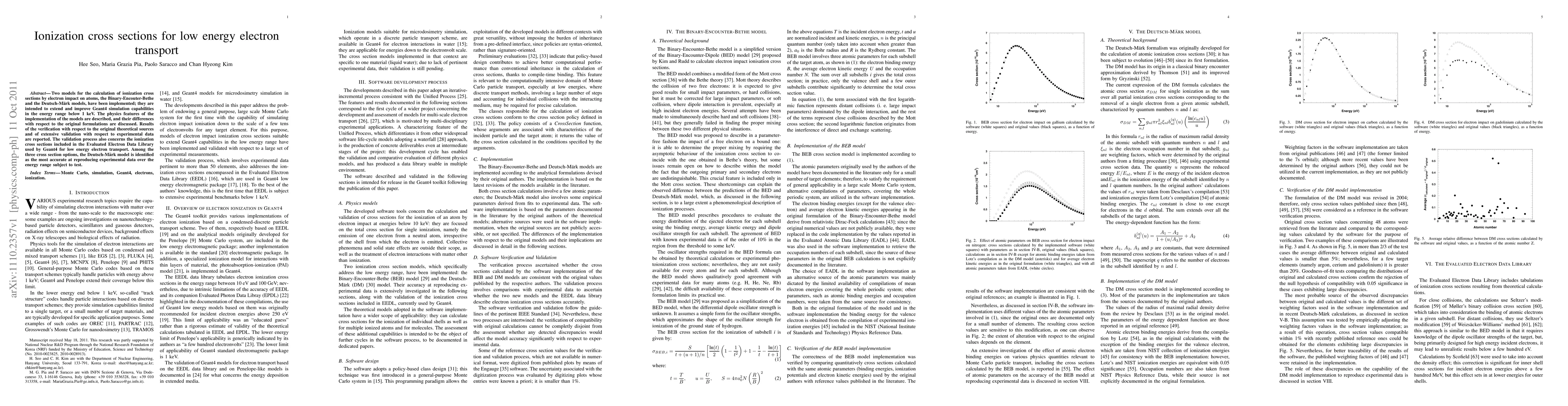This paper implements two ionization cross section models for low energy electron impact on atoms to enhance Geant4 simulation capabilities below 1 keV. The Binary-Encounter-Bethe and Deutsch-Maerk models are compared, with the latter found to most accurately reproduce experimental data.