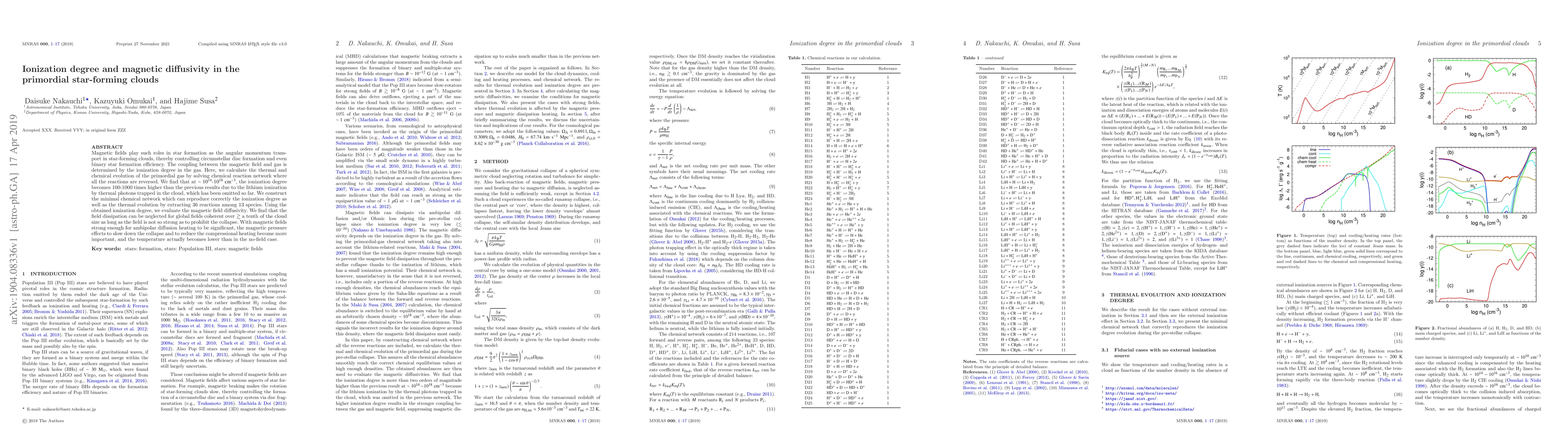 This paper investigates the ionization degree and magnetic diffusivity in primordial star-forming clouds, finding that the ionization degree is significantly higher due to lithium ionization by trapped thermal photons. The study shows that magnetic fields can slow down the collapse and reduce heating, with field dissipation negligible for coherent global fields unless the field is too strong to allow collapse.