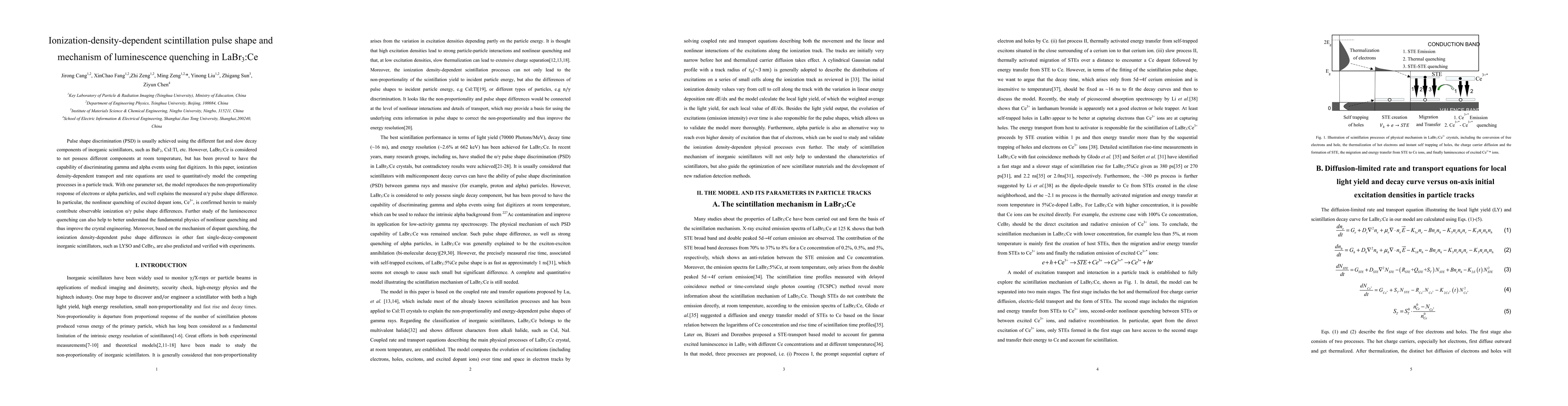Pulse-shape discrimination (PSD) is usually achieved using the different fast and slow decay components of inorganic scintillators, such as BaF2, CsI:Tl, etc. However, LaBr3:Ce is considered to not possess different components at room temperature, but has been proved to have the capability of discriminating {\gamma} and {\alpha} events using fast digitizers. In this paper, ionization-density-dependent transport and rate equations are used to quantitatively model the competing processes in a particle track. With one parameter set, the model reproduces the nonproportionality response of electrons or {\alpha} particles, and explains the measured {\alpha} and {\gamma} pulse-shape difference well. In particular, the nonlinear quenching of excited dopant ions, Ce3+, is confirmed herein to mainly contribute observable ionization {\alpha} and {\gamma} pulse-shape differences. Further study of the luminescence quenching can also help to better understand the fundamental physics of nonlinear quenching and thus improve the crystal engineering. Moreover, based on the mechanism of dopant quenching, the ionization-density-dependent pulse-shape differences in other fast single-decay-component inorganic scintillators, such as lutetium yttrium oxyorthosilicate, Lu2(1-x)Y2xSiO5:Ce (LYSO) and CeBr3, are also predicted and verified with experiments.