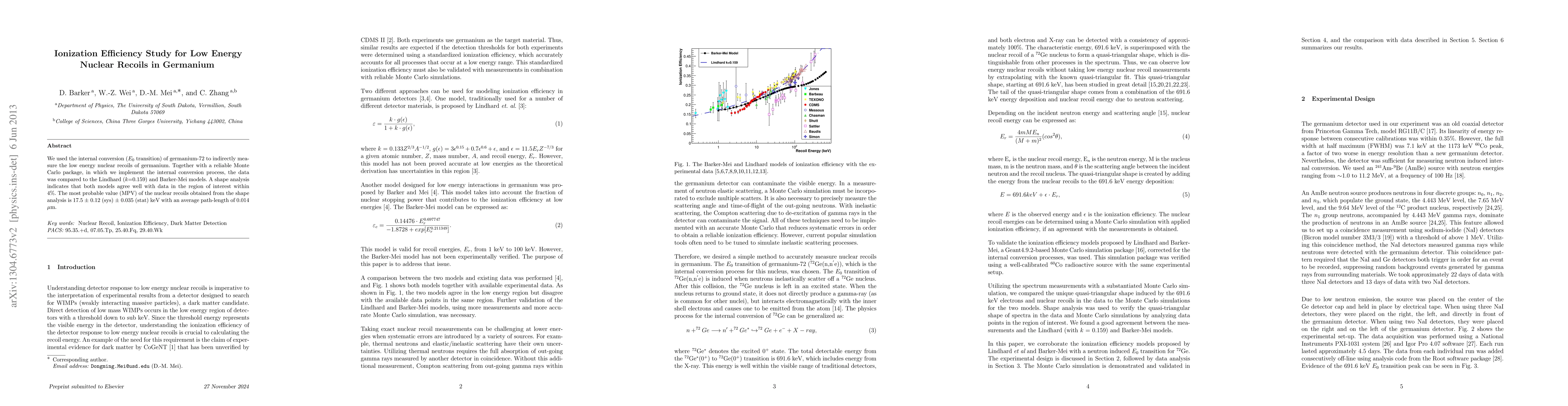 This study measures low energy nuclear recoils in germanium using internal conversion of germanium-72 and compares the results to the Lindhard and Barker-Mei models, finding both models agree within 4% in the region of interest. The most probable value of the nuclear recoils is 17.5 keV with an average path-length of 0.014 µm.