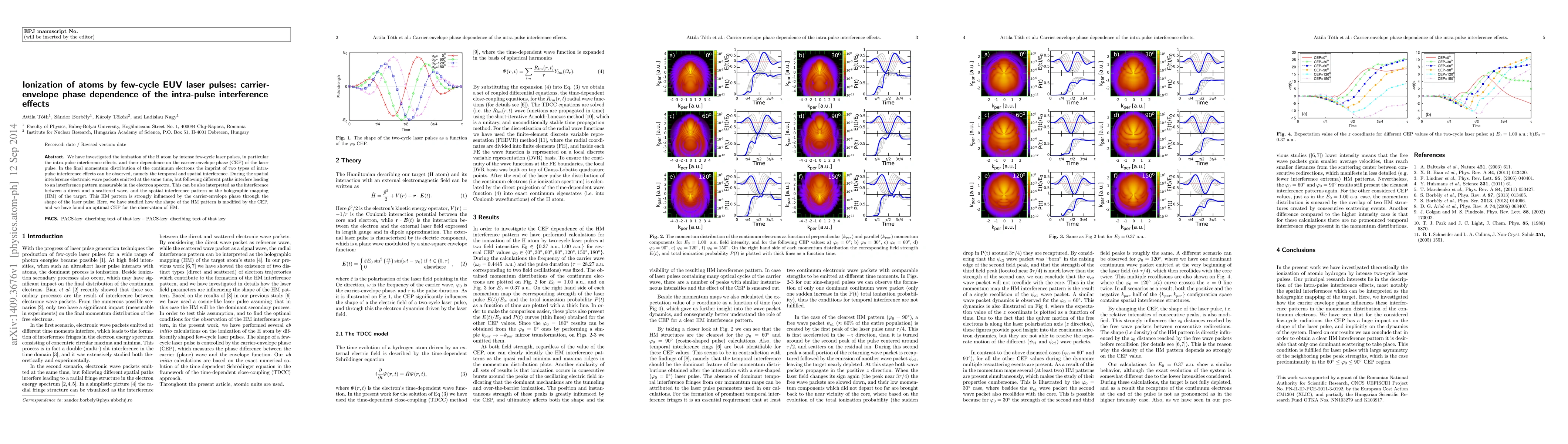 This paper investigates the ionization of hydrogen atoms by intense few-cycle extreme ultraviolet (EUV) laser pulses, focusing on intra-pulse interference effects and their dependence on the carrier-envelope phase (CEP). The study reveals that spatial interference patterns in the electron spectra are strongly influenced by the CEP, identifying an optimal CEP for observing these holographic mapping patterns.