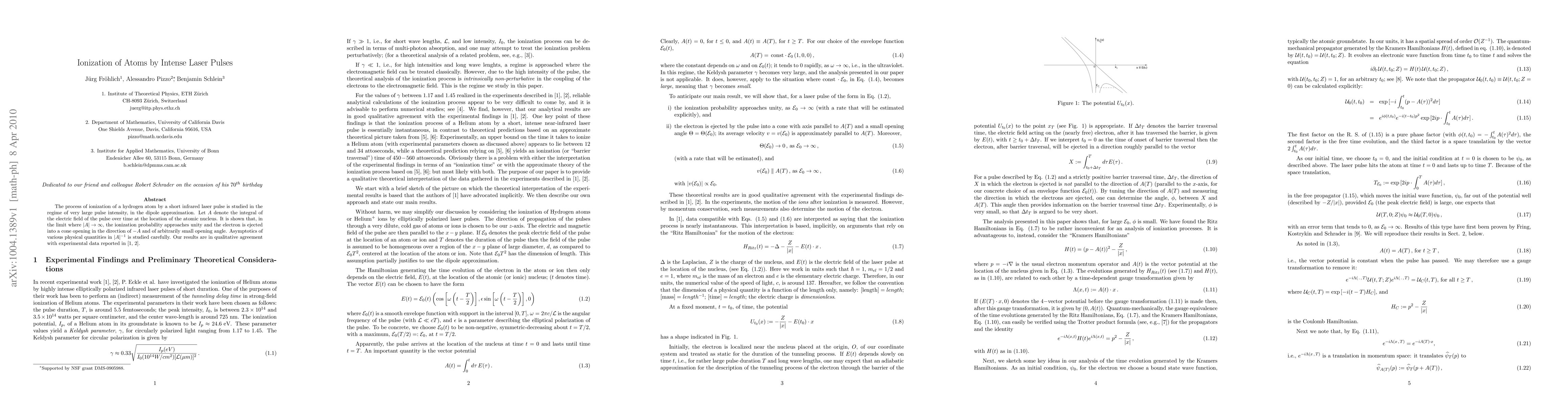 This paper investigates the ionization of a hydrogen atom by extremely intense, short infrared laser pulses, finding that as pulse intensity approaches infinity, the atom ionizes with near certainty, ejecting the electron in a narrow cone directed away from the pulse polarization. Results align with experimental observations.