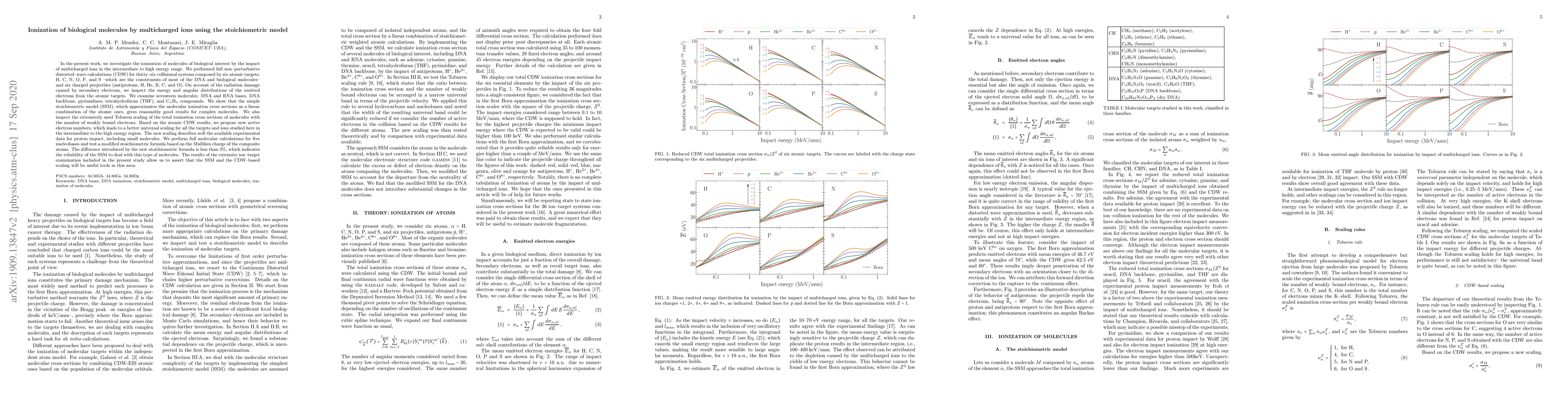 In the present work, we investigate the ionization of molecules of biological interest by the impact of multicharged ions in the intermediate to high energy range. We performed full non-perturbative distorted-wave calculations (CDW) for thirty-six collisional systems composed by six atomic targets: H, C, N, O, F, and S -which are the constituents of most of the DNA and biological molecules- and six charged projectiles (antiprotons, H, He, B, C, and O). On account of the radiation damage caused by secondary electrons, we inspect the energy and angular distributions of the emitted electrons from the atomic targets. We examine seventeen molecules: DNA and RNA bases, DNA backbone, pyrimidines, tetrahydrofuran (THF), and C n H n compounds. We show that the simple stoichiometric model (SSM), which approximates the molecular ionization cross sections as a linear combination of the atomic ones, gives reasonably good results for complex molecules. We also inspect the extensively used Toburen scaling of the total ionization cross sections of molecules with the number of weakly bound electrons. Based on the atomic CDW results, we propose new active electron numbers, which leads to a better universal scaling for all the targets and ions studied here in the intermediate to the high energy region. The new scaling describes well the available experimental data for proton impact, including small molecules. We perform full molecular calculations for five nucleobases and test a modified stoichiometric formula based on the Mulliken charge of the composite atoms. The difference introduced by the new stoichiometric formula is less than 3%, which indicates the reliability of the SSM to deal with this type of molecules. The results of the extensive ion-target examination included in the present study allow us to assert that the SSM and the CDW-based scaling will be useful tools in this area.