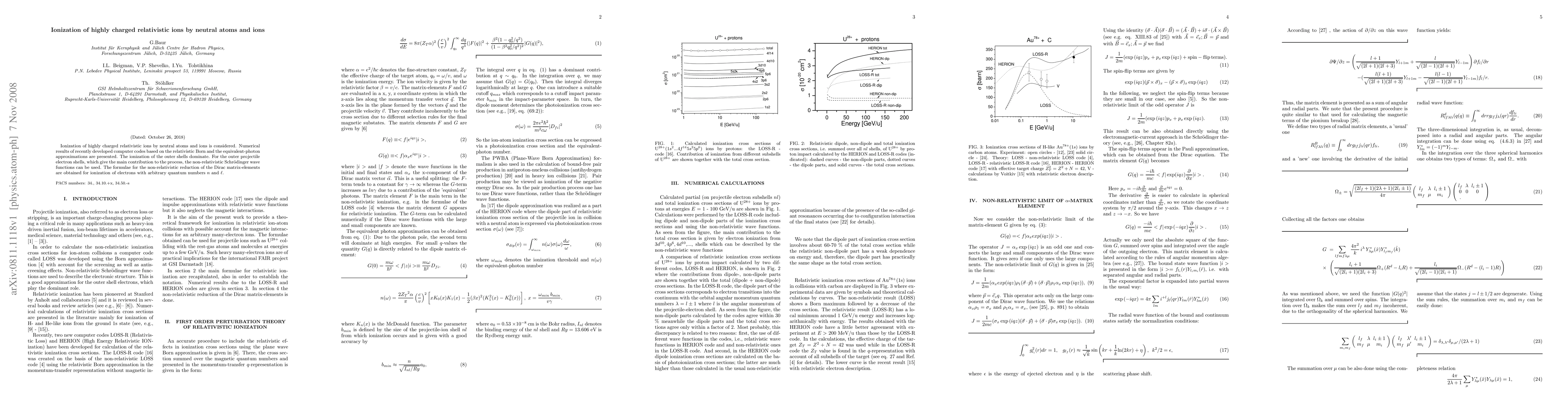 This paper investigates the ionization of highly charged relativistic ions by neutral atoms and ions using advanced numerical methods. The study finds that ionization primarily occurs in the outer electron shells, where non-relativistic Schrödinger wave functions are applicable, and provides formulas for the non-relativistic reduction of Dirac matrix elements for ionization with arbitrary quantum numbers.