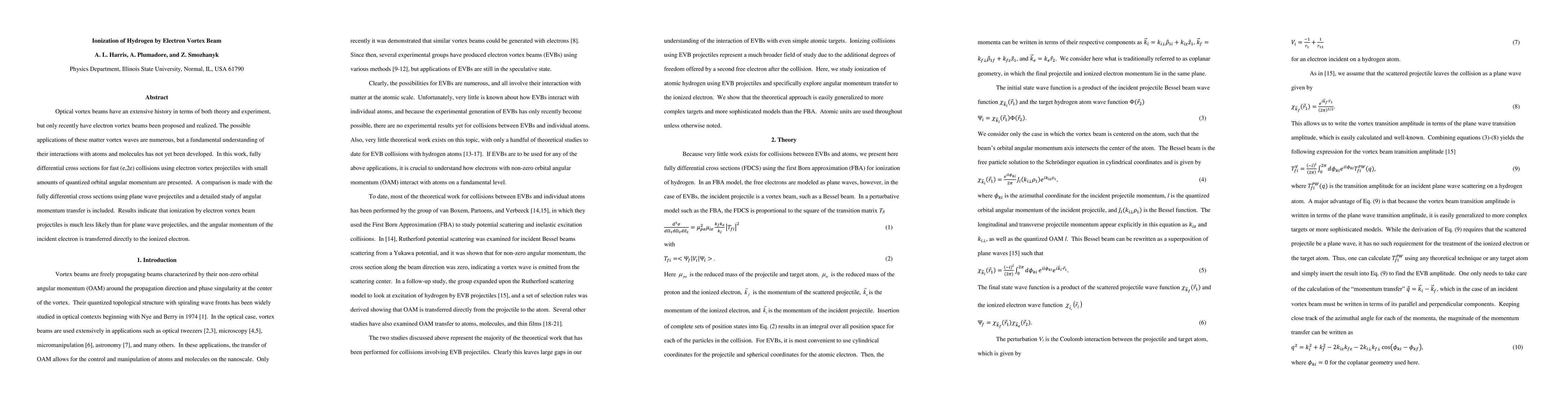 This research presents the differential cross sections for ionization of hydrogen using electron vortex beams compared to plane wave electrons, revealing that vortex beams are less effective in ionization but transfer their orbital angular momentum to the ionized electron.