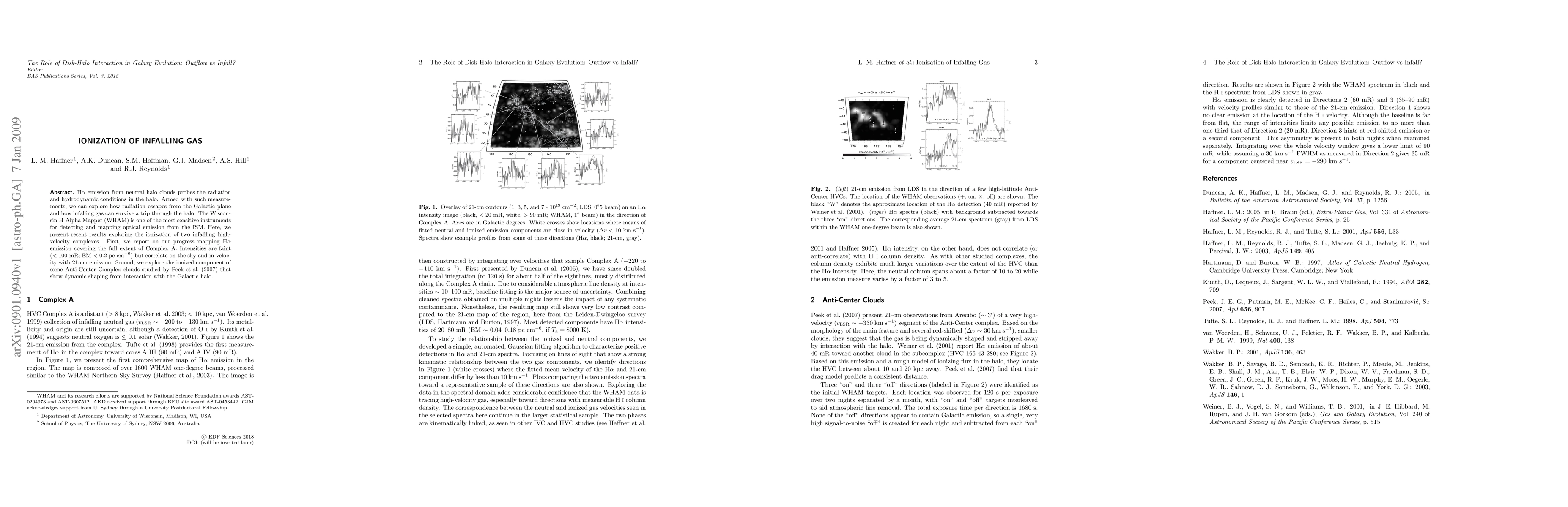 H-alpha emission from neutral halo clouds probes the radiation and hydrodynamic conditions in the halo. Armed with such measurements, we can explore how radiation escapes from the Galactic plane and how infalling gas can survive a trip through the halo. The Wisconsin H-Alpha Mapper (WHAM) is one of the most sensitive instruments for detecting and mapping optical emission from the ISM. Here, we present recent results exploring the ionization of two infallling high-velocity complexes. First, we report on our progress mapping H-alpha emission covering the full extent of Complex A. Intensities are faint (<100 mR; EM <0.2 pc cm^-6 but correlate on the sky and in velocity with 21-cm emission. Second, we explore the ionized component of some Anti-Center Complex clouds studied by Peek et al. (2007) that show dynamic shaping from interaction with the Galactic halo.