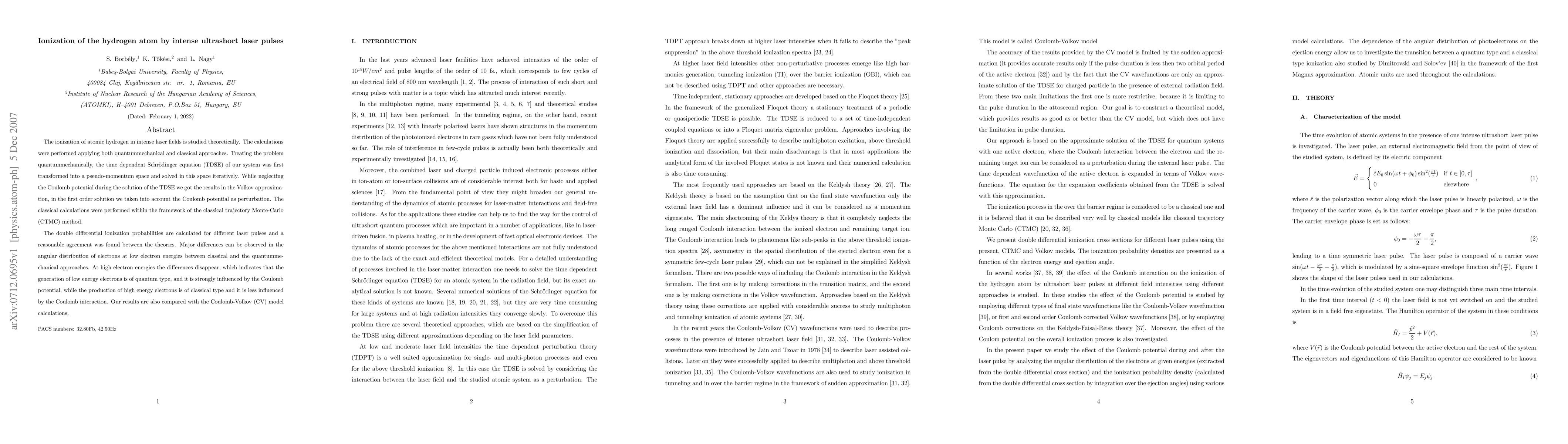 This paper investigates the ionization of hydrogen atoms under intense ultrashort laser pulses using both quantum mechanical and classical methods. Quantum calculations show that low-energy electron generation is strongly influenced by the Coulomb potential, while high-energy electron production is classical and less affected by it.