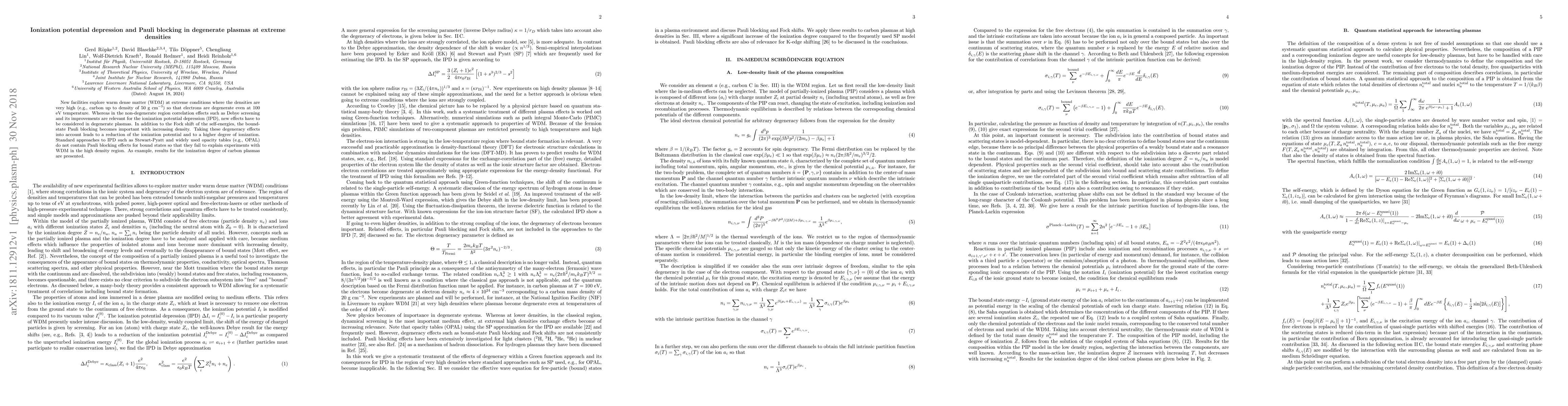New facilities explore warm dense matter (WDM) at extreme conditions where the densities are very high (e.g., carbon up to density of 50 g cm$^{-3}$) so that electrons are degenerate even at 100 eV temperature. Whereas in the non-degenerate region correlation effects such as Debye screening and its improvements are relevant for the ionization potential depression (IPD), new effects have to be considered in degenerate plasmas. In addition to the Fock shift of the self-energies, the bound-state Pauli blocking becomes important with increasing density. Taking these degeneracy effects into account leads to a reduction of the ionization potential and to a higher degree of ionization. Standard approaches to IPD such as Stewart-Pyatt and widely used opacity tables (e.g., OPAL) do not contain Pauli blocking effects for bound states so that they fail to explain experiments with WDM in the high density region. As example, results for the ionization degree of carbon plasmas are presented.