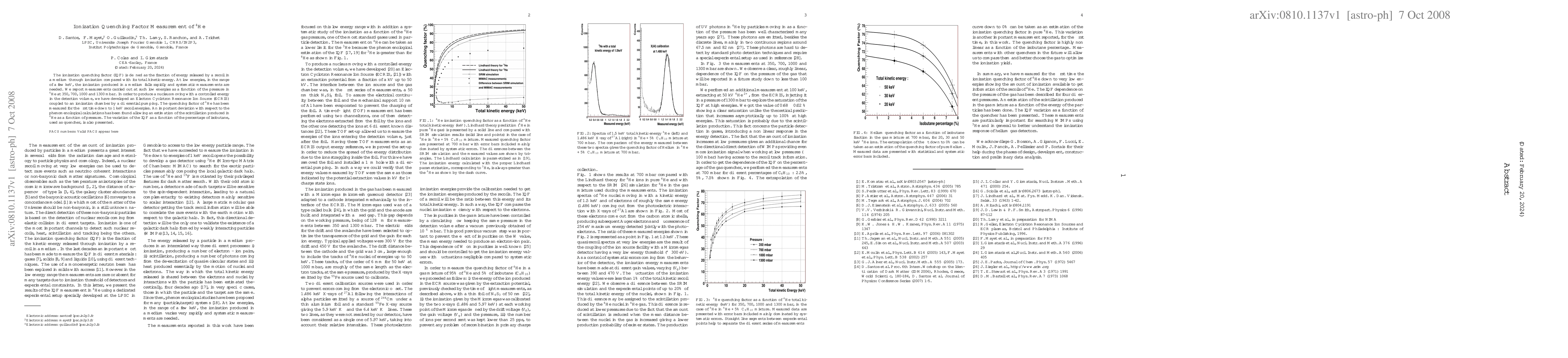 The ionization quenching factor (IQF) is defined as the fraction of energy released by a recoil in a medium through ionization compared with its total kinetic energy. At low energies, in the range of a few keV, the ionization produced in a medium falls rapidly and systematic measurements are needed. We report measurements carried out at such low energies as a function of the pressure in He4 at 350, 700, 1000 and 1300 mbar. In order to produce a nucleus moving with a controlled energy in the detection volume, we have developed an Electron Cyclotron Resonance Ion Source (ECRIS) coupled to an ionization chamber by a differential pumping. The quenching factor of He4 has been measured for the first time down to 1 keV recoil energies. An important deviation with respect to the phenomenological calculations has been found allowing an estimation of the scintillation produced in He4 as a function of pressure. The variation of the IQF as a function of the percentage of isobutane, used as quencher, is also presented.