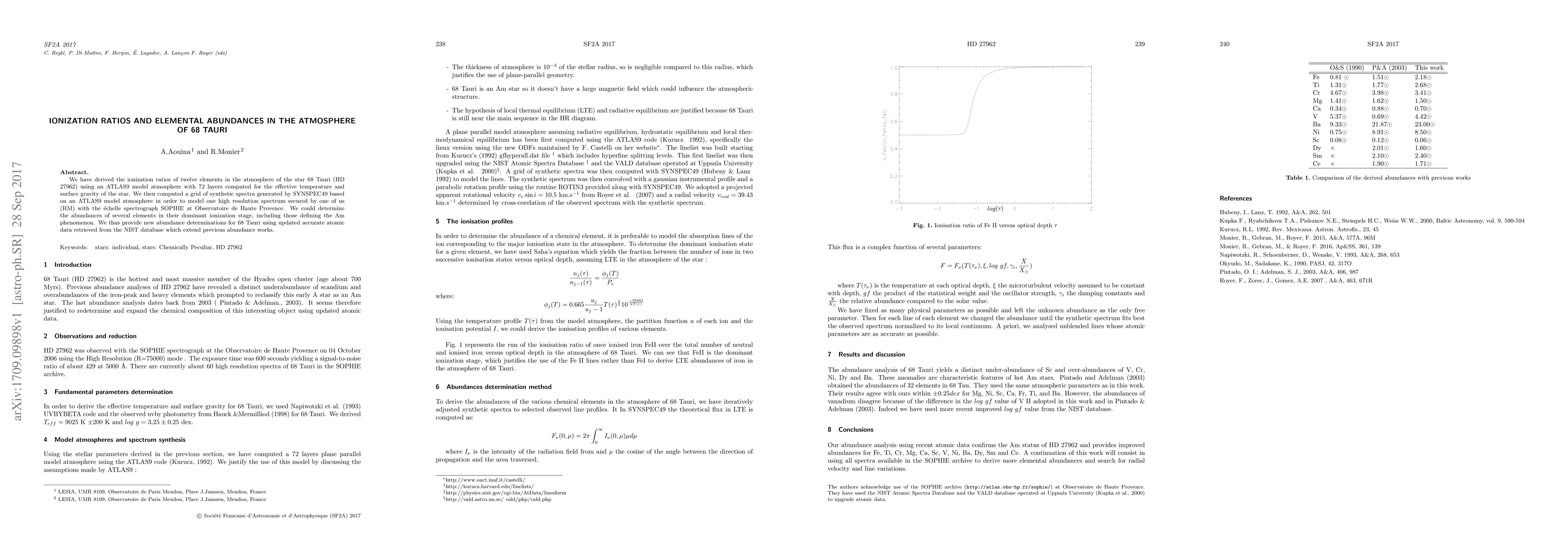 We have derived the ionization ratios of twelve elements in the atmosphere of the star 68 Tauri (HD 27962) using an ATLAS9 model atmosphere with 72 layers computed for the effective temperature and surface gravity of the star. We then computed a grid of synthetic spectra generated by SYNSPEC49 based on an ATLAS9 model atmosphere in order to model one high resolution spectrum secured by one of us (RM) with the echelle spectrograph SOPHIE at Observatoire de Haute Provence. We could determine the abundances of several elements in their dominant ionization stage, including those defining the Am phenomenon. We thus provide new abundance determinations for 68 Tauri using updated accurate atomic data retrieved from the NIST database which extend previous abundance works.