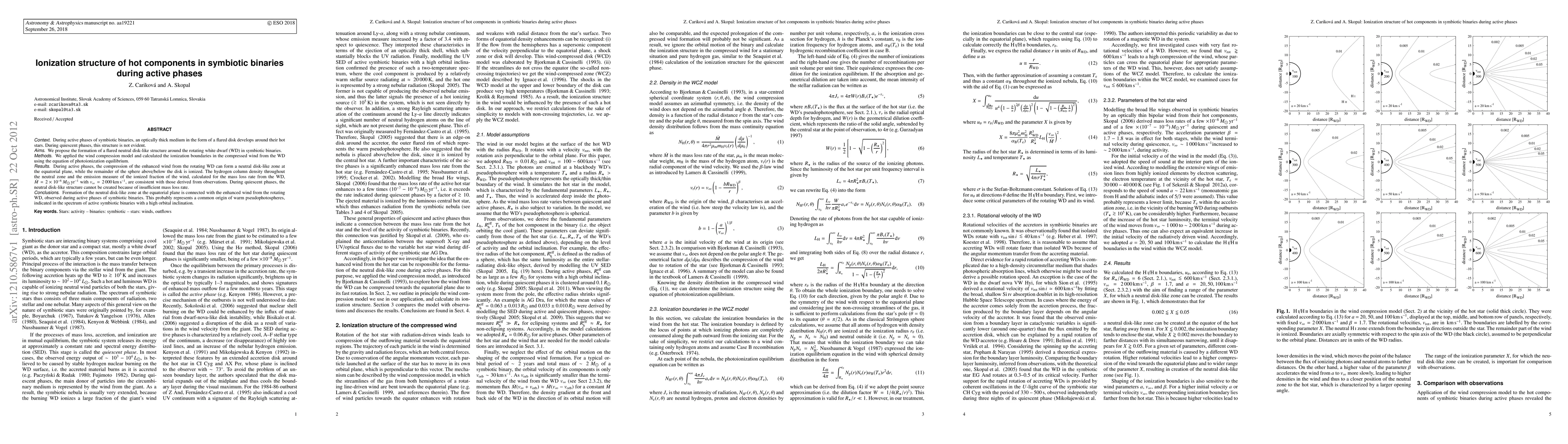 This paper investigates the ionization structure of hot components in symbiotic binaries during active phases, proposing a flared neutral disk-like structure around rotating white dwarfs. The model suggests that enhanced winds from these stars form a neutral zone during active phases, while quiescent phases lack sufficient mass loss to create such a structure.