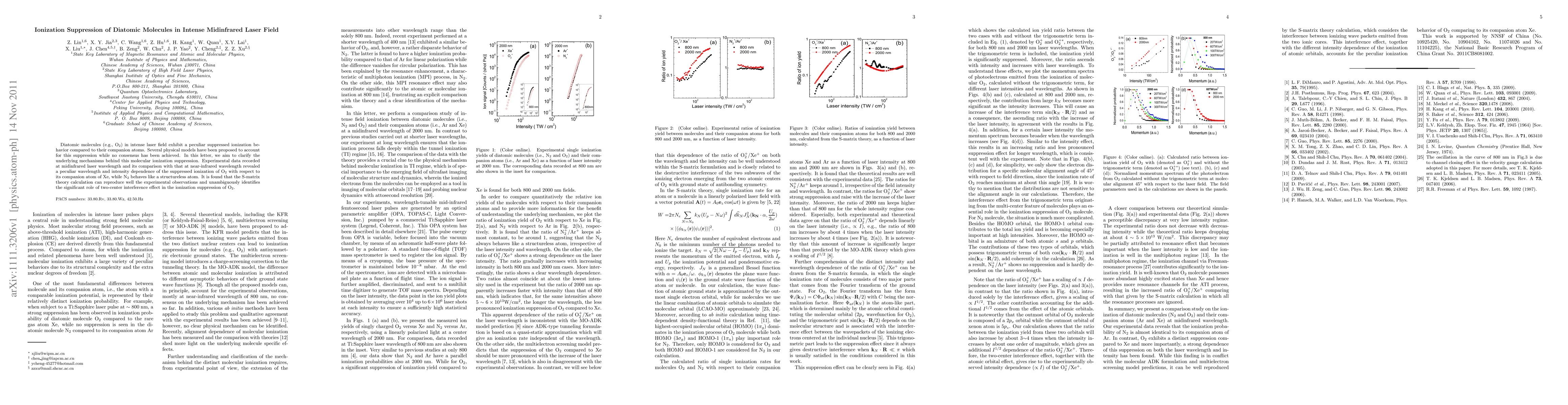 This paper investigates the ionization suppression of diatomic molecules like O$_2$ in intense midinfrared laser fields, revealing a wavelength and intensity dependence compared to atoms like Xe. The study finds that two-center interference effects, as identified by S-matrix theory calculations, play a crucial role in the suppressed ionization of O$_2$.