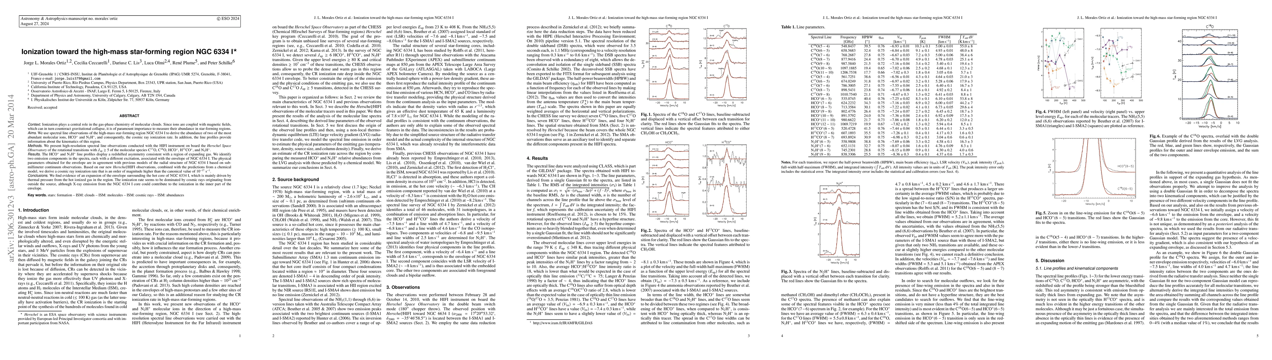 This study uses high-resolution spectral line observations from the Herschel Space Observatory to determine the abundance of molecular ions HCO+ and N2H+ in the high-mass star-forming region NGC 6334 I, revealing an order of magnitude higher cosmic ray ionization rate than previously thought, indicating an expanding gas envelope driven by thermal pressure.