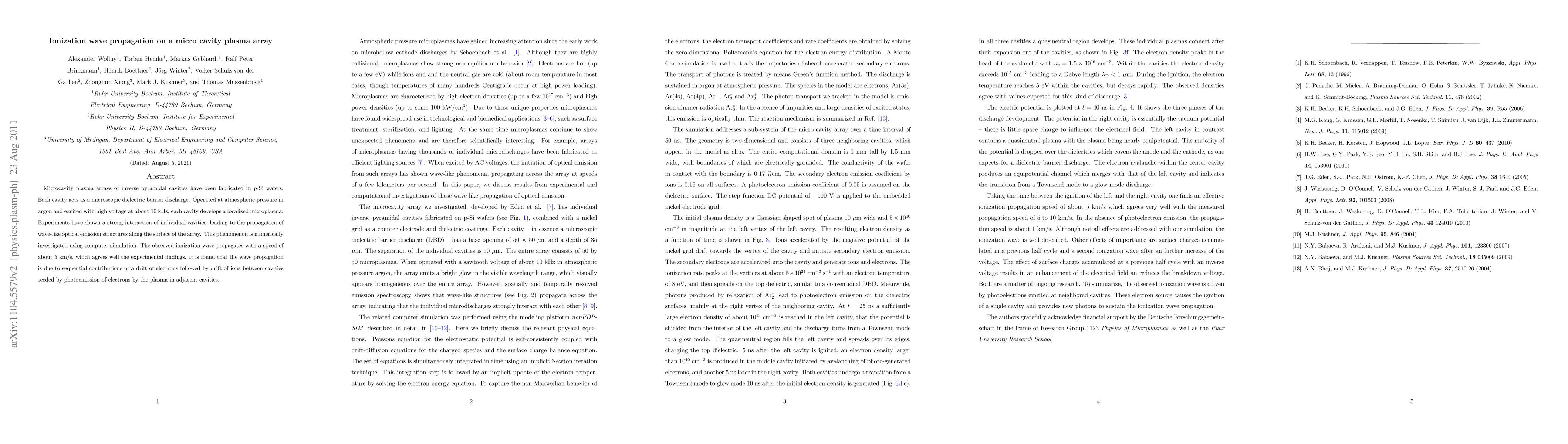 Microcavity plasma arrays of inverse pyramidal cavities have been fabricated in p-Si wafers. Each cavity acts as a microscopic dielectric barrier discharge. Operated at atmospheric pressure in argon and excited with high voltage at about 10 kHz, each cavity develops a localized microplasma. Experiments have shown a strong interaction of individual cavities, leading to the propagation of wave-like optical emission structures along the surface of the array. This phenomenon is numerically investigated using computer simulation. The observed ionization wave propagates with a speed of about 5 km/s, which agrees well the experimental findings. It is found that the wave propagation is due to sequential contributions of a drift of electrons followed by drift of ions between cavities seeded by photoemission of electrons by the plasma in adjacent cavities.