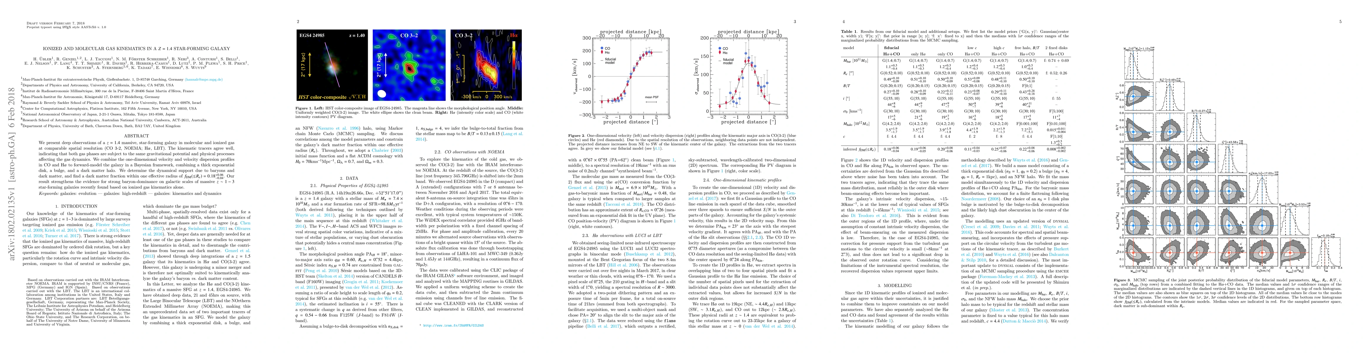 This study investigates the kinematics of ionized and molecular gas in a $z=1.4$ star-forming galaxy, finding that both gas phases are influenced by the same gravitational potential. The analysis reveals a dark matter fraction within the effective radius of 0.18, supporting the notion of baryon-dominance in massive star-forming galaxies at high redshifts.