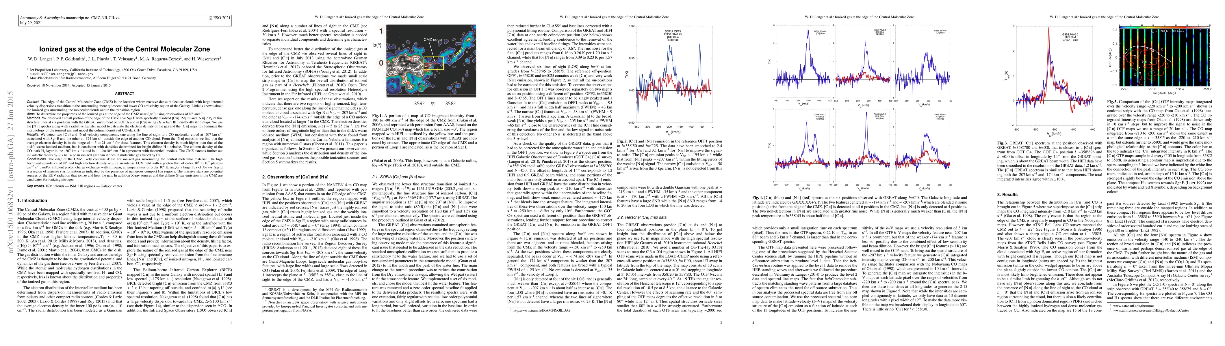 To determine the properties of the ionized gas at the edge of the CMZ near Sgr E we observed a small portion of the edge of the CMZ near Sgr E with spectrally resolved [C II] 158 micron and [N II] 205 micron fine structure lines at six positions with the GREAT instrument on SOFIA and in [C II] using Herschel HIFI on-the-fly strip maps. We use the [N II] spectra along with a radiative transfer model to calculate the electron density of the gas and the [C II] maps to illuminate the morphology of the ionized gas and model the column density of CO-dark H2. We detect two [C II] and [N II] velocity components, one along the line of sight to a CO molecular cloud at -207 km/s associated with Sgr E and the other at -174 km/s outside the edge of another CO cloud. From the [N II] emission we find that the average electron density is in the range of about 5 to 25 cm{-3} for these features. This electron density is much higher than that of the warm ionized medium in the disk. The column density of the CO-dark H$_2$ layer in the -207 km/s cloud is about 1-2X10{21} cm{-2} in agreement with theoretical models. The CMZ extends further out in Galactic radius by 7 to 14 pc in ionized gas than it does in molecular gas traced by CO. The edge of the CMZ likely contains dense hot ionized gas surrounding the neutral molecular material. The high fractional abundance of N+ and high electron density require an intense EUV field with a photon flux of order 1e6 to 1e7 photons cm{-2} s{-1}, and/or efficient proton charge exchange with nitrogen, at temperatures of order 1e4 K, and/or a large flux of X-rays. Sgr E is a region of massive star formation which are a potential sources of the EUV radiation that can ionize the gas. In addition X-ray sources and the diffuse X-ray emission in the CMZ are candidates for ionizing nitrogen.