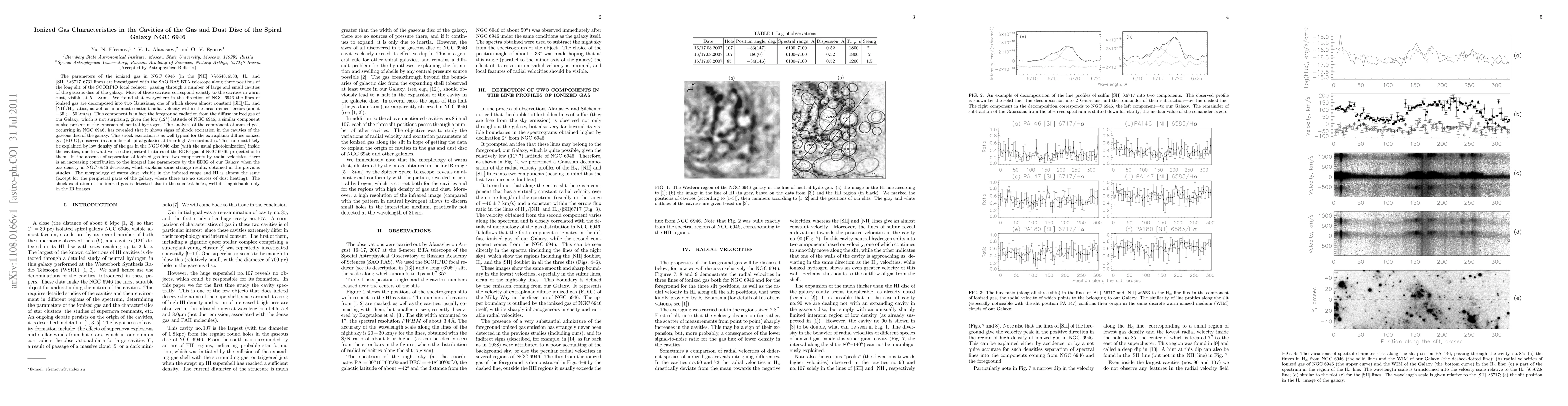 This study investigates the ionized gas characteristics in the cavities of NGC 6946's gas and dust disc, revealing shock excitation signs in the galaxy's gaseous disc cavities. The observed spectral features suggest a low-density gas environment, likely due to the extraplanar diffuse ionized gas (EDIG) influence.