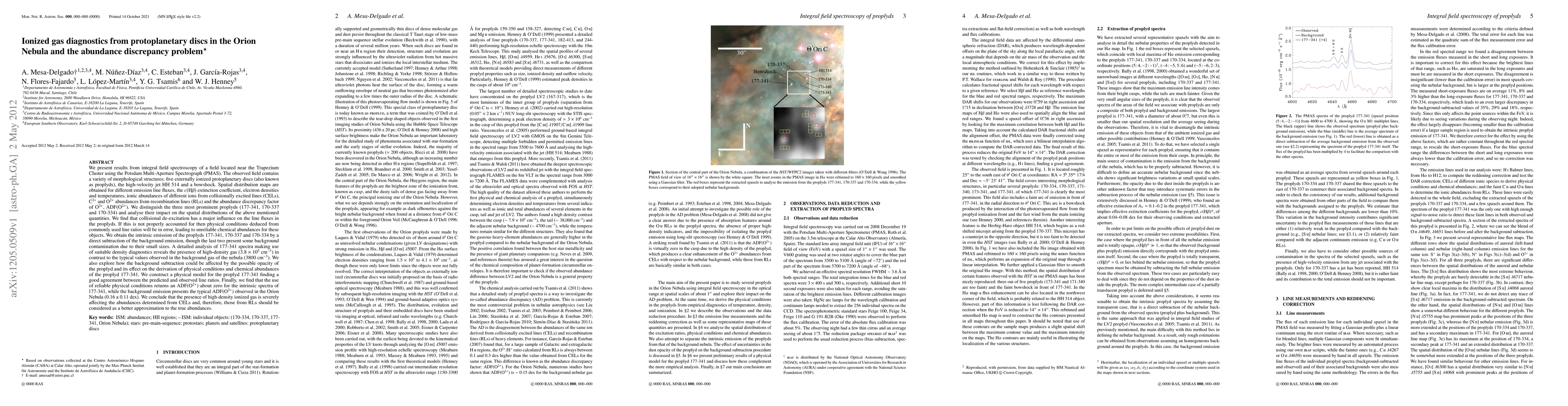 We present results from integral field spectroscopy with PMAS. The observed field contains: five protoplanetary discs (also known as proplyds), the high-velocity jet HH 514 and a bowshock. Spatial distribution maps are obtained for different emission line fluxes, the c(H{\beta}) coefficient, electron densities and temperatures, ionic abundances of different ions from collisionally excited lines (CELs), C2+ and O2+ abundances from recombination lines (RLs) and the abundance discrepancy factor of O2+, ADF(O2+). We find that collisional de-excitation has a major influence on the line fluxes in the proplyds. If this is not properly accounted for then physical conditions deduced from commonly used line ratios will be in error, leading to unreliable chemical abundances for these objects. We obtain the intrinsic emission of the proplyds 177-341, 170-337 and 170-334 by a direct subtraction of the background emission, though the last two present some background contamination due to their small sizes. A detailed analysis of 177-341 spectra reveals the presence of high-density gas (3.8\times10^5 cm^-3) in contrast to the typical values observed in the background gas of the nebula (3800 cm^-3). We also explore how the background subtraction could be affected by the possible opacity of the proplyd. We construct a physical model for the proplyd 177-341 finding a good agreement between the predicted and observed line ratios. Finally, we find that the use of reliable physical conditions returns an ADF(O2+) about zero for the intrinsic spectra of 177-341, while the background emission presents the typical ADF(O2+) observed in the Orion Nebula. We conclude that the presence of high-density ionized gas is severely affecting the abundances determined from CELs and, therefore, those from RLs should be considered as a better approximation to the true abundances.