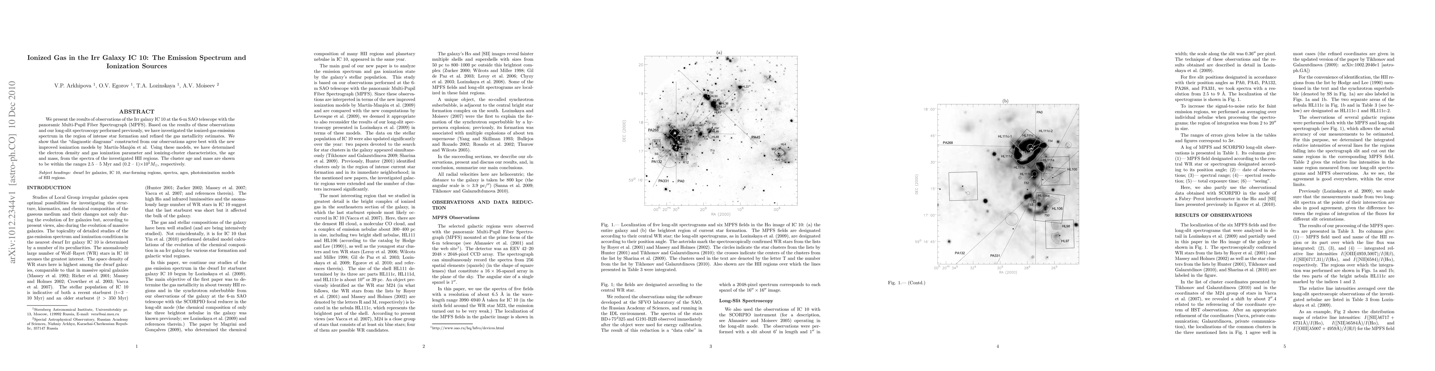 We present the results of observations of the Irr galaxy IC 10 at the 6-m SAO telescope with the panoramic Multi-Pupil Fiber Spectrograph (MPFS). Based on the results of these observations and our long-slit spectroscopy performed previously, we have investigated the ionized-gas emission spectrum in the region of intense star formation and refined the gas metallicity estimates. We show that the "diagnostic diagrams" constructed from our observations agree best with the new improved ionization models by Martin-Manjon et al. Using these models, we have determined the electron density and gas ionization parameter and ionizing-cluster characteristics, the age and mass, from the spectra of the investigated HII regions. The cluster age and mass are shown to be within the ranges 2.5 - 5 Myr and (0.2 - 1)*10^5 M(sun), respectively.